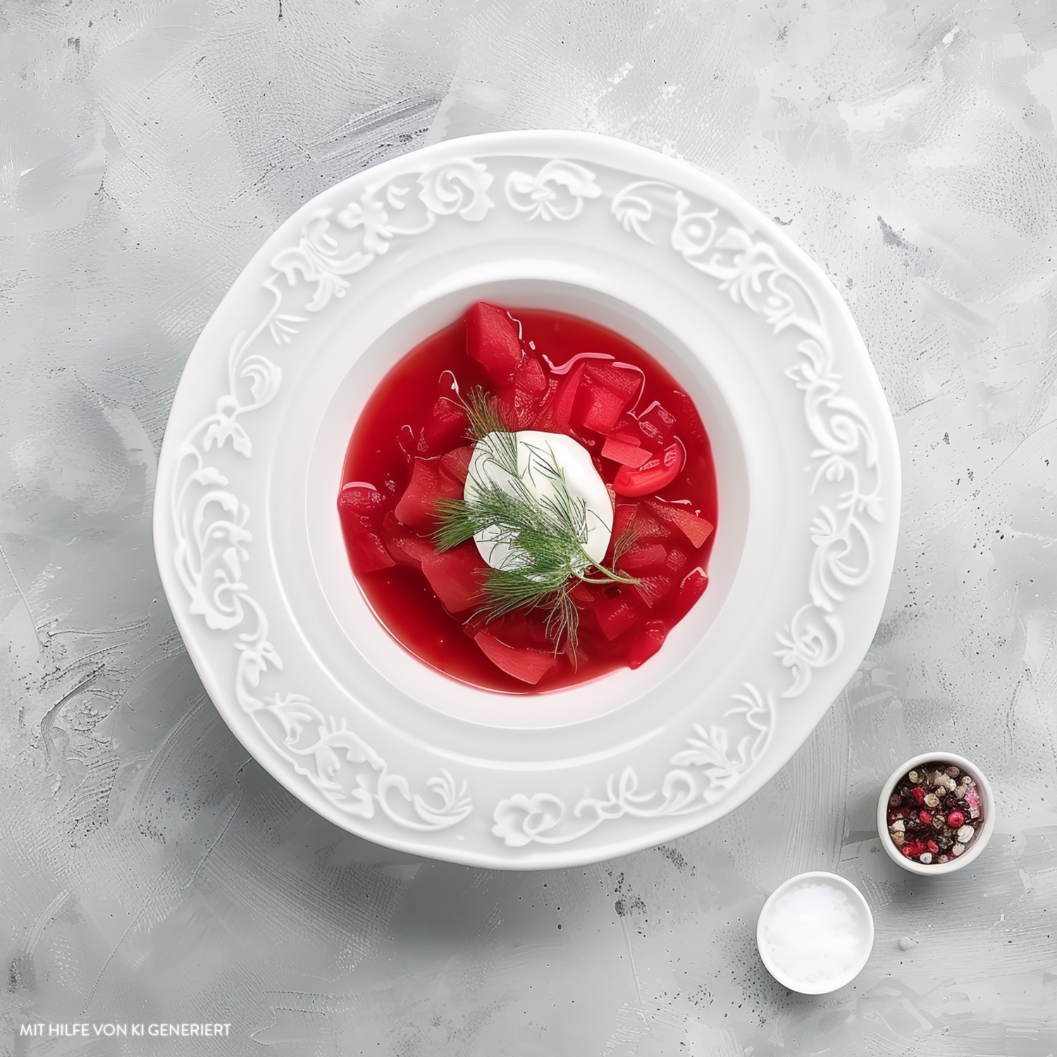 - Den Borschtsch mit Essig, Salz, Pfeffer und 1 Prise Zucker abschmecken. Optional kannst du einen Teil der Suppe pürieren, um eine cremigere Konsistenz zu erhalten.