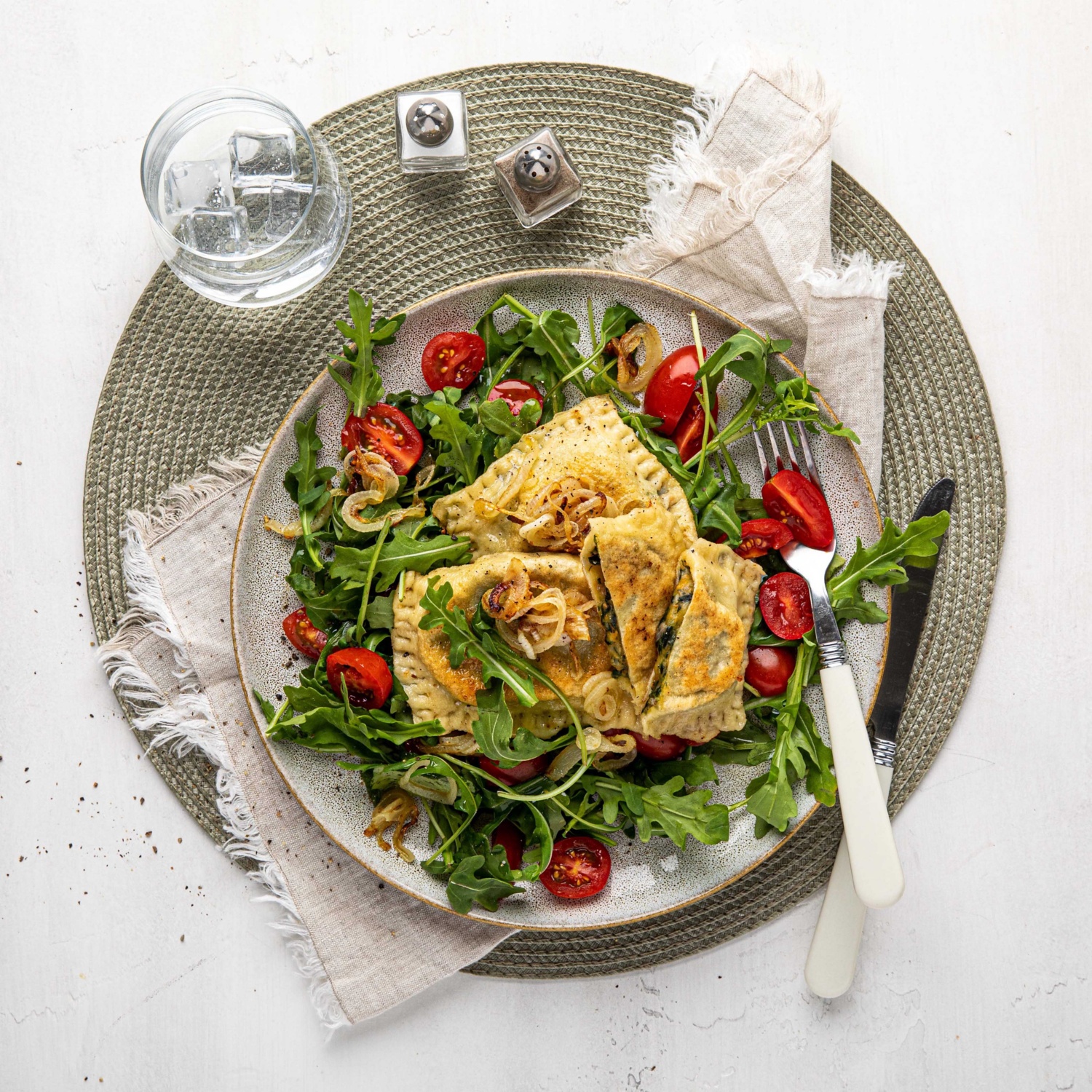 - Die Maultauschen und die gebratenen Zwiebeln auf dem Salat anrichten und servieren.