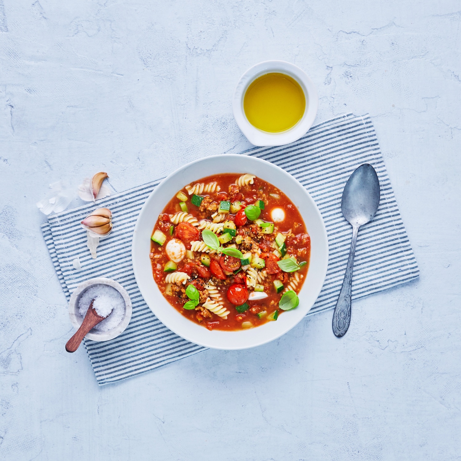 - Die Nudeln in den Suppentopf geben, 10 Minuten köcheln lassen und verrühren. Nach 5 Minuten die Mozzarella-Minis hineingeben.