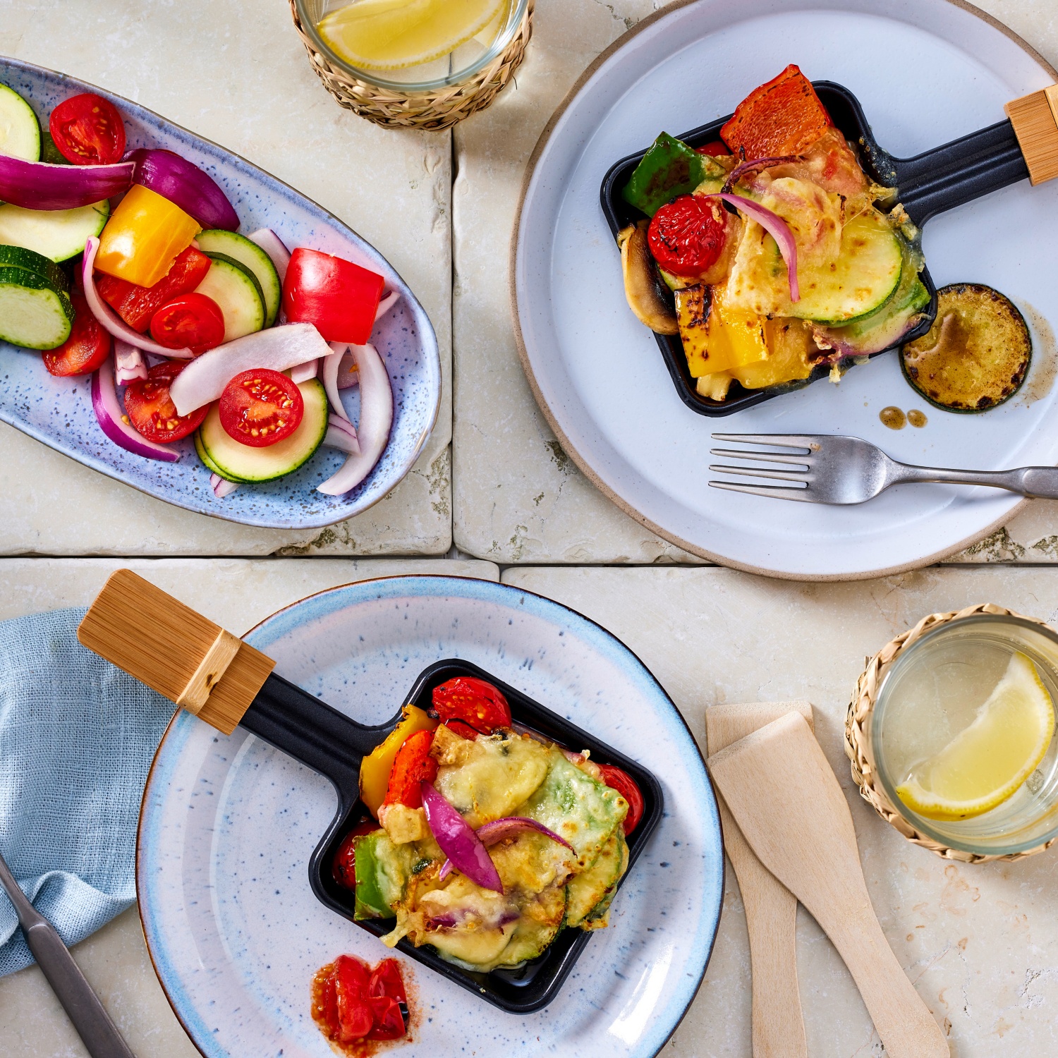 - Gemüse und Käse auf Schalen verteilen. Gemüsestücke nach Belieben auf die Raclette-Pfännchen verteilen, mit jeweils 1 Scheibe Käse belegen und unter dem heißen Raclette-Gerät 6–7 Minuten gratinieren.