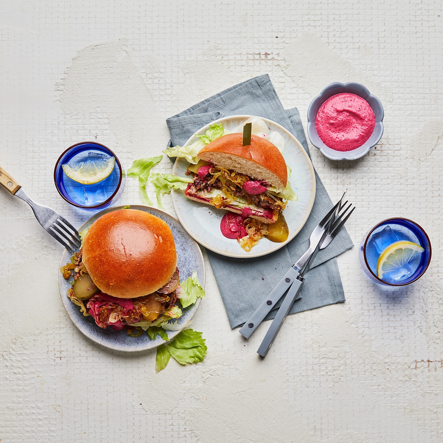 Dieser vegetarische Burger überzeugt durch herzhafte Kidneybohnen-Patties, eine leuchtend pinke Rote-Bete-Mayonnaise und süße karamellisierte Zwiebeln. Zum Rezept