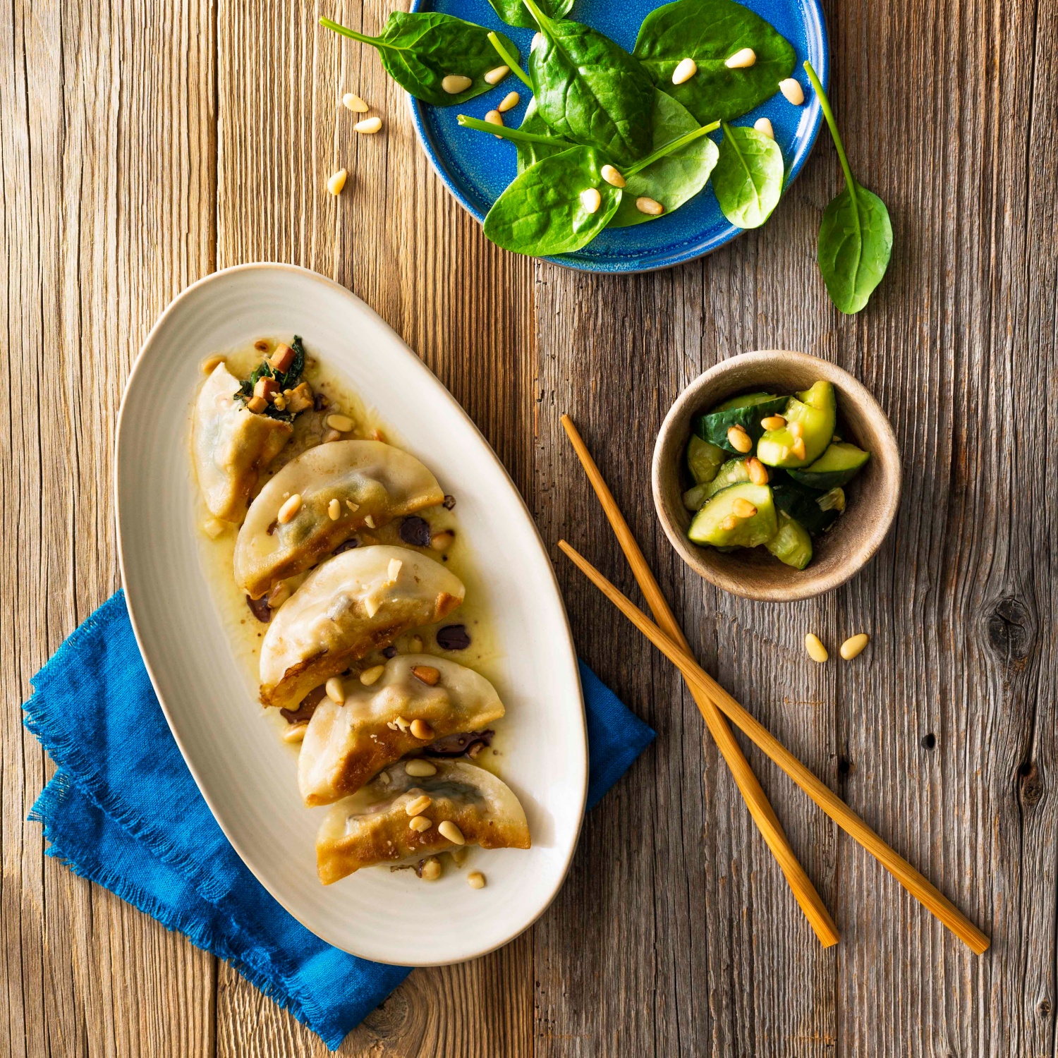 - Gyozas auf Tellern anrichten, Sauce darüber geben, mit restlichen Pinienkernen toppen und zusammen mit Gurkensalat servieren.