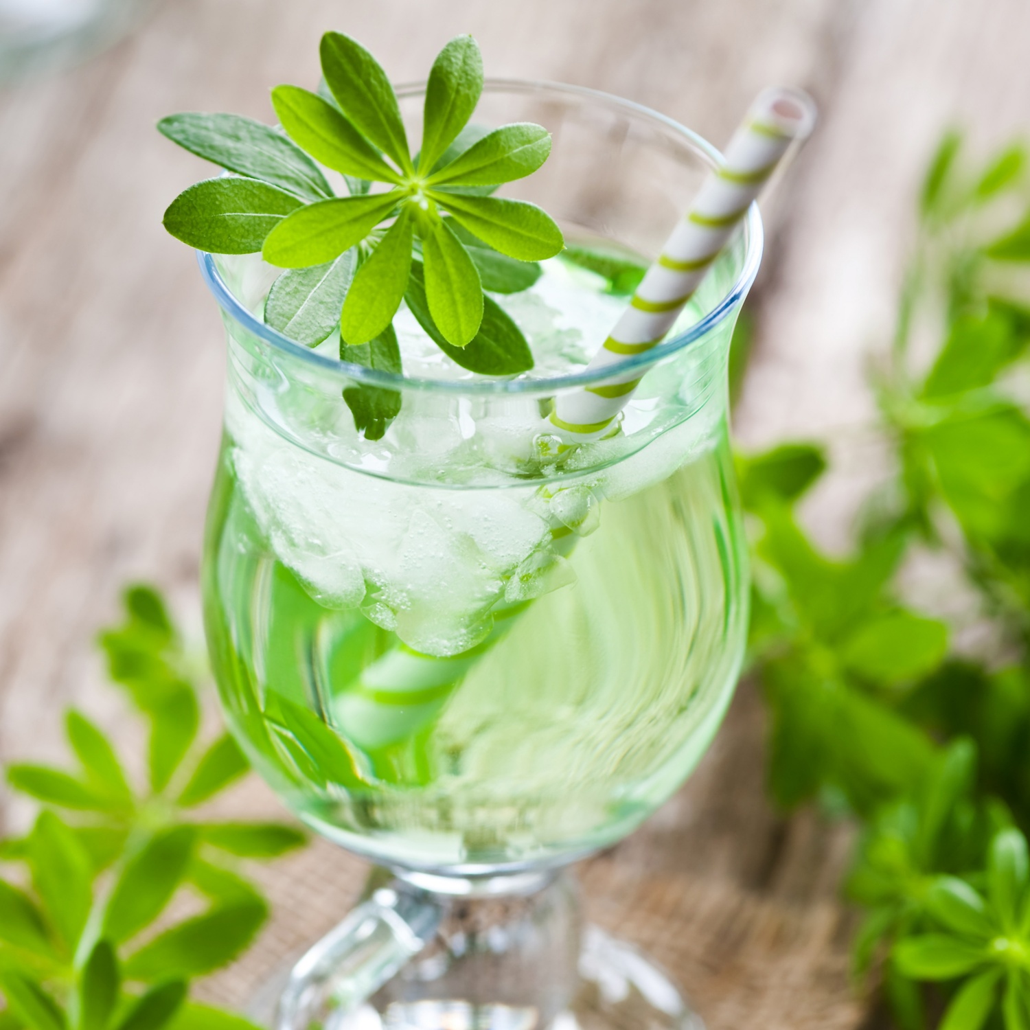 1. Waldmeister zusammenbinden und kopfüber in 250 ml Weißwein und 1 TL Zucker ziehen lassen. Nach 45 Minuten herausnehmen.