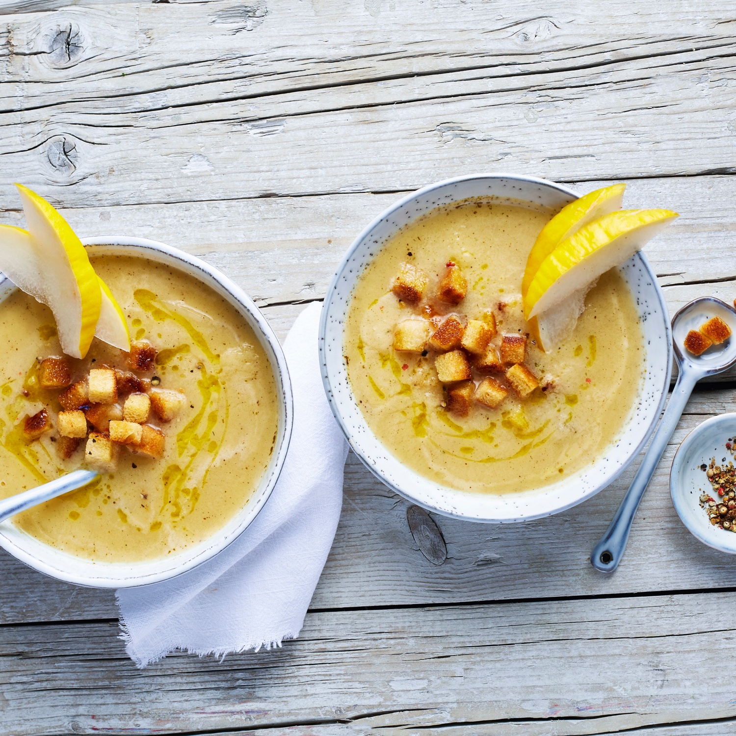 Die warme Honigmelonensuppe mit den Croûtons und buntem Pfeffer bestreut servieren.