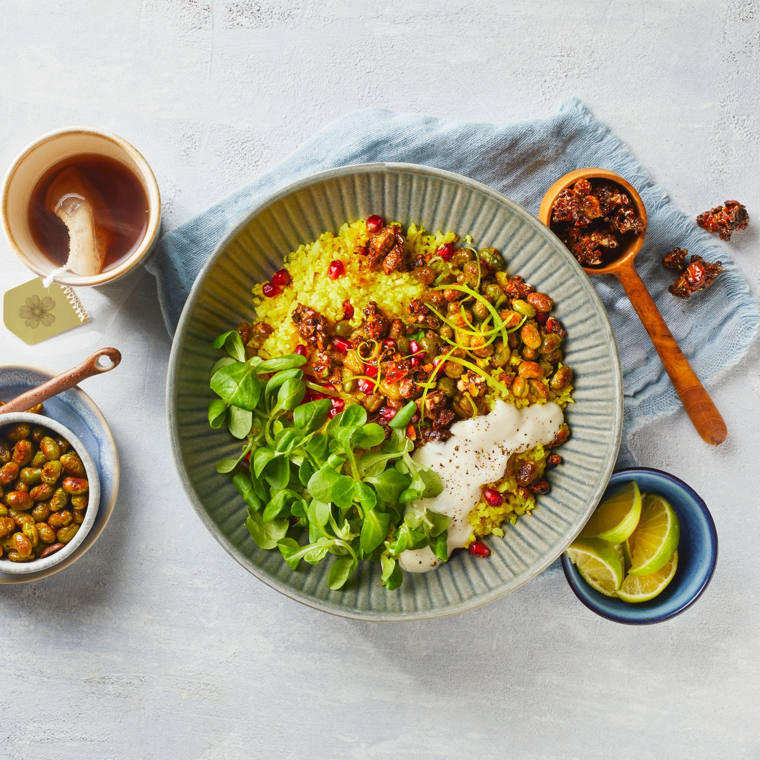 Warmer Blumenkohlreis mit Kurkuma, Granatapfel und Kräuter-Crunch
