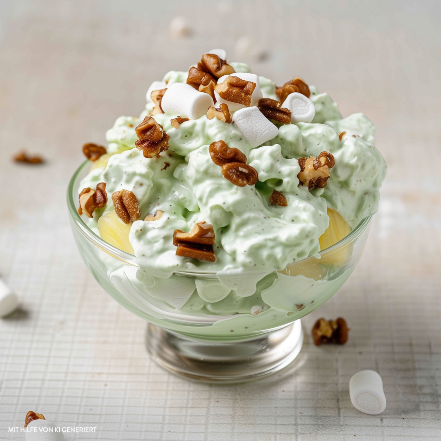 - 50 g Walnüsse hacken und zusammen mit 100 g Mini-Marshmallows unterheben.