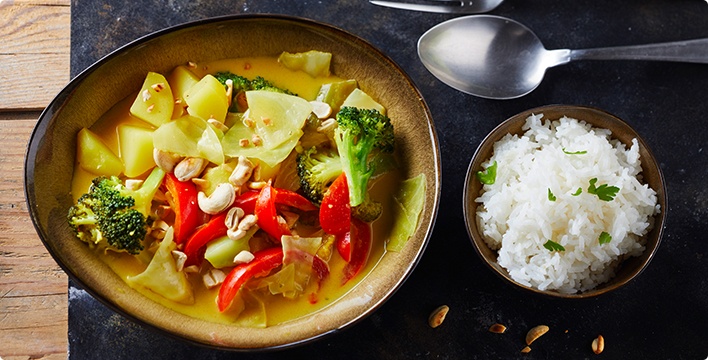 - Währenddessen die Cashewkerne grob zerstoßen und in einer Pfanne leicht anrösten. Das Curry beispielsweise zusammen mit Jasminreis servieren. Zum Schluss mit den gerösteten Cashewkernen bestreuen.