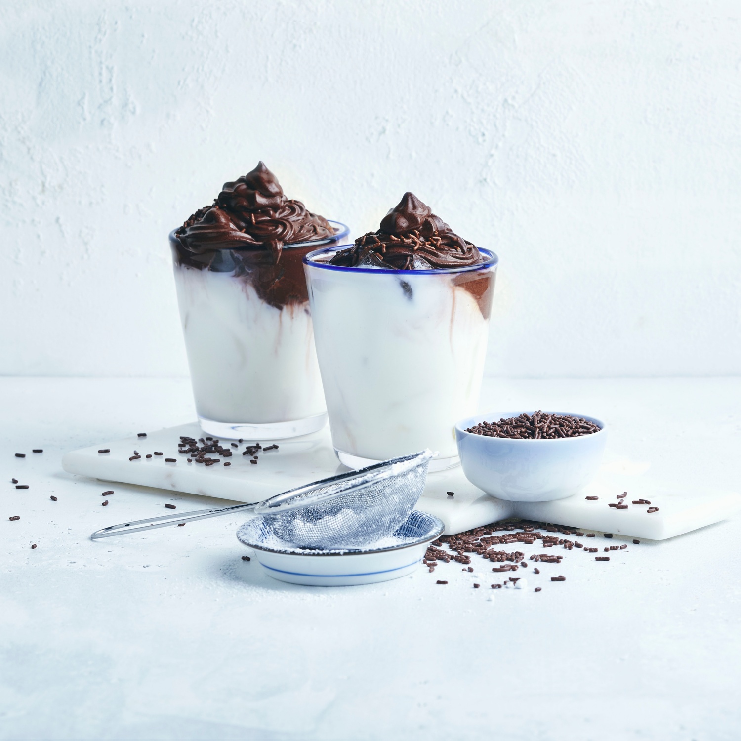 Die Milch in ein Glas mit Eiswürfeln füllen. Die Kakaocreme in einen Spritzbeutel geben und als Topping auf die Milch geben. Mit Schokostreuseln garnieren.