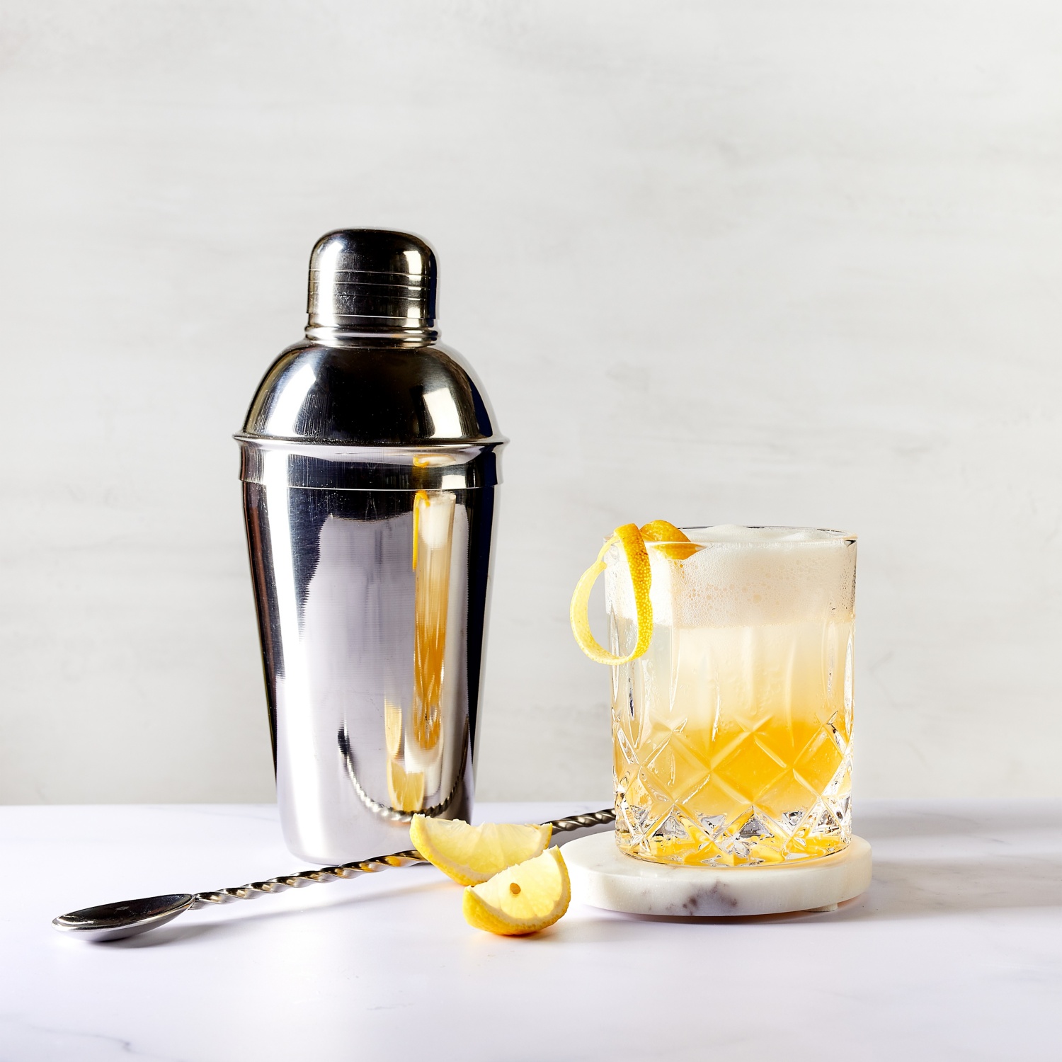Den Whiskey, 3 cl Zitronensaft, den Zuckersirup und das Eiweiß zusammen mit ein paar Eiswürfeln in einen Cocktailshaker geben und gut schütteln.