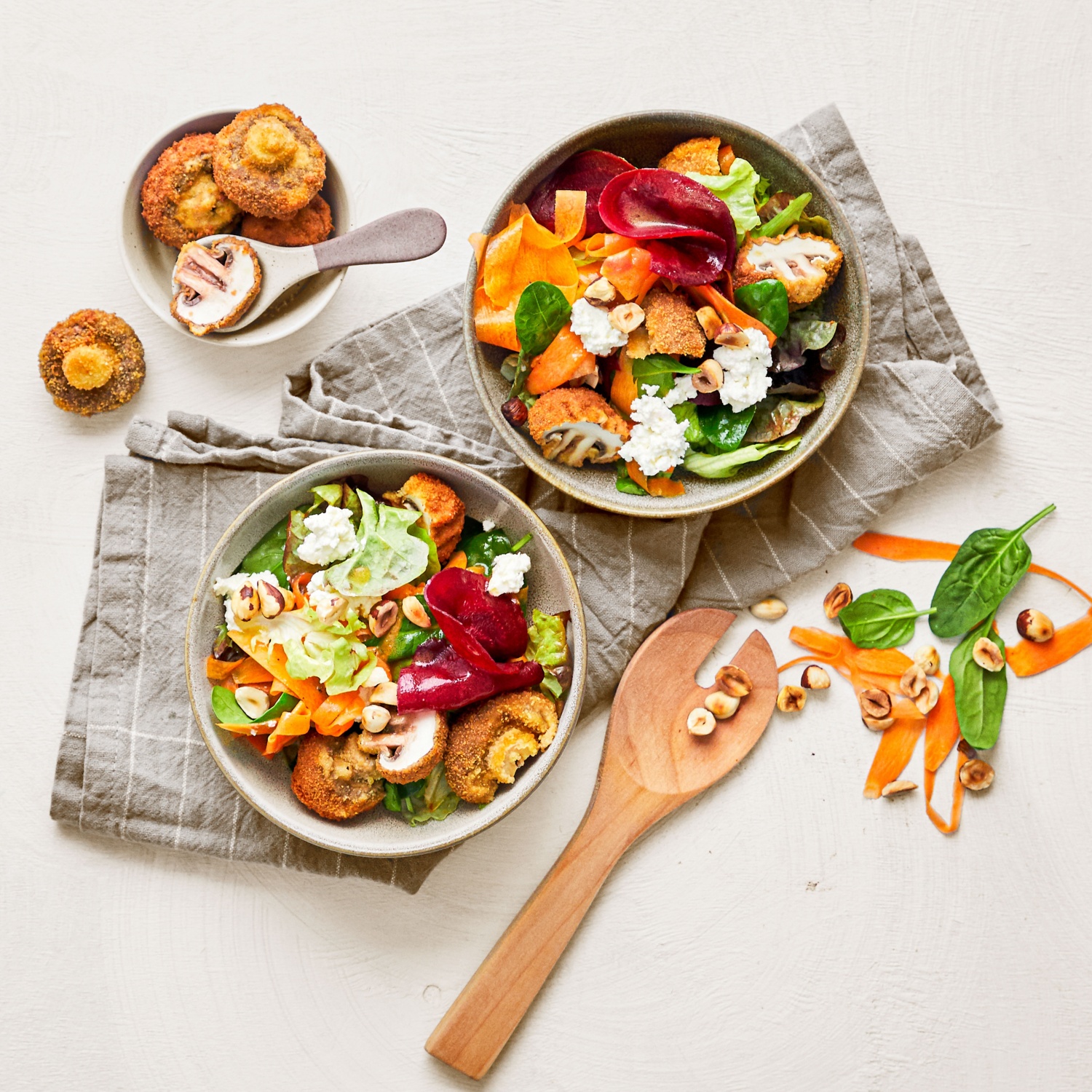 - Den Salat mit den Karotten, der Roten Bete und den frittierten Champignons anrichten. Mit den Haselnüssen und dem zerkrümelten Ziegenfrischkäse garnieren. Das Dressing dazu reichen.