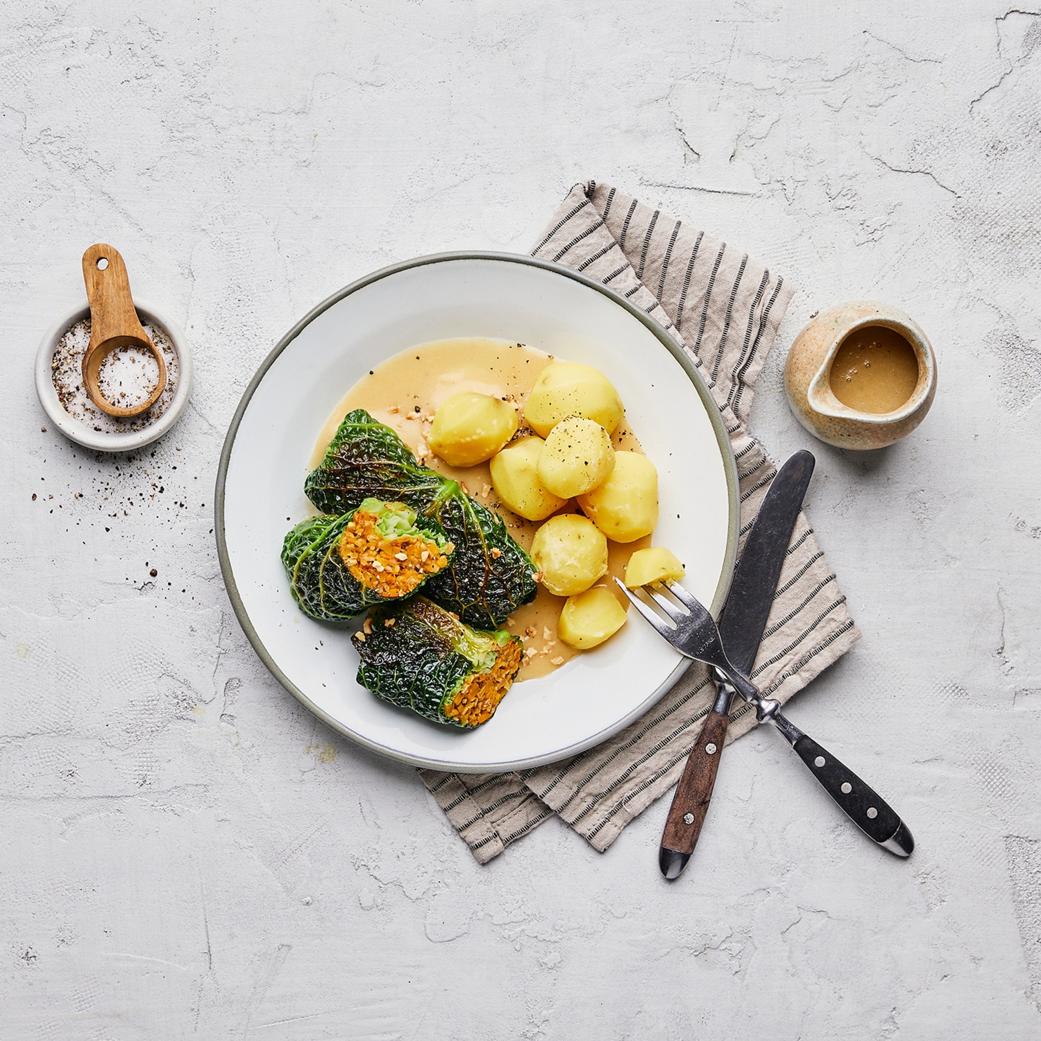 Wirsing-Rouladen mit Kürbis-Nuss-Füllung