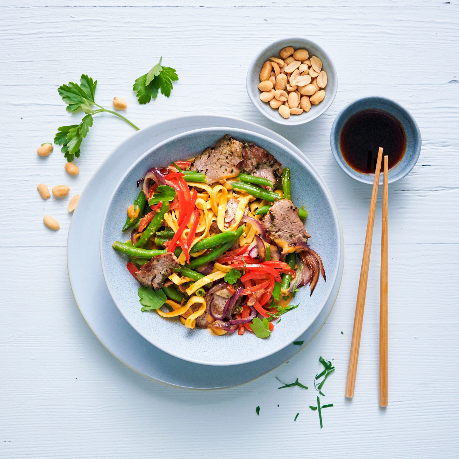 - Die Wok-Nudeln in den Wok geben und darin ca. 4 Minuten garen. Das Fleisch untermischen. Mit frischer Petersilie garniert servieren.
