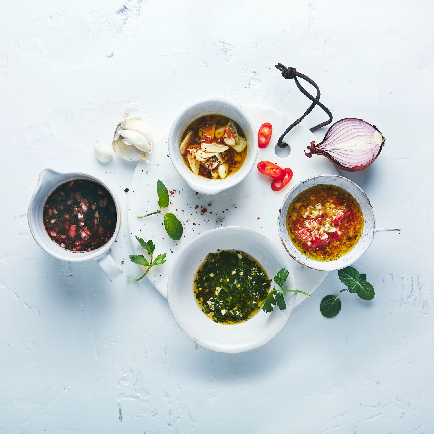 1. Für die Kräutermarinade die Kräuter fein hacken und mit dem Olivenöl mischen. Die Zitrone heiß abwaschen und einen Teelöffel Schale abreiben. Mit Salz, Pfeffer und der Zitronenschale abschmecken.