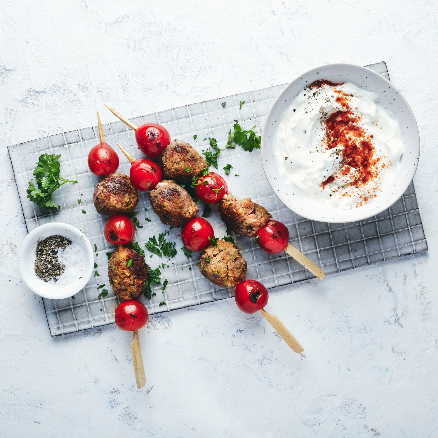 Würzige Hackspieße vom Grill mit Schafskäse-Dip