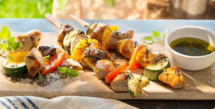 - Gemüse und Bratwurststücke gleichmäßig auf 4 Grillspieße stecken und auf dem vorbereiteten Grill bei mittlerer bis starker Hitze ca. 10 Minuten grillen. Die Spieße dabei hin und wieder drehen und mit dem gewürzten Olivenöl bestreichen.