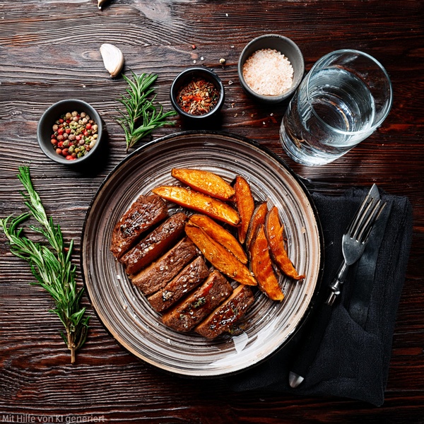 8. Die Rindersteaks zusammen mit den Süßkartoffeln anrichten und mit der restlichen Teriyakisauce servieren.
