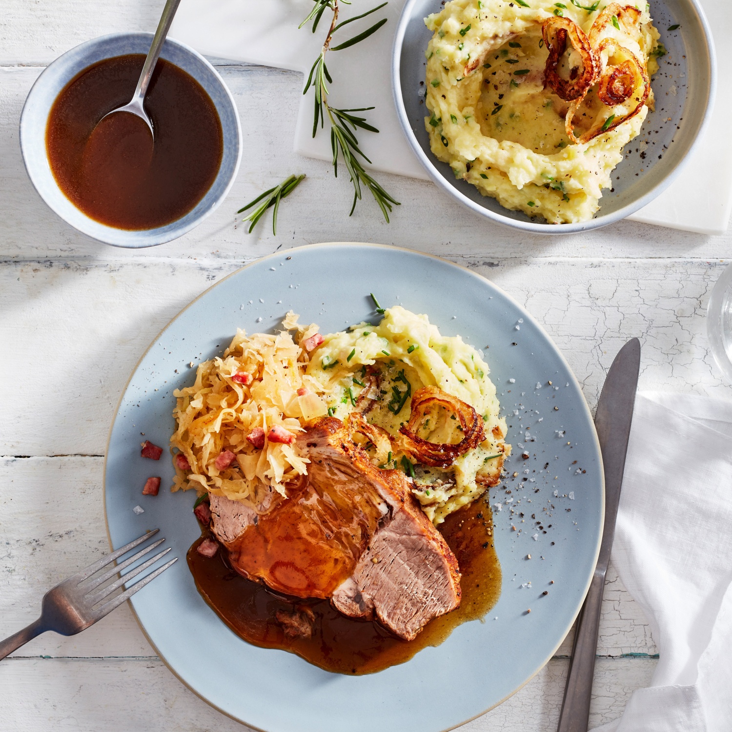 6. Den Schweinenackenbraten zusammen mit der Sauce, dem Sauerkraut und dem Kartoffelstampf servieren.