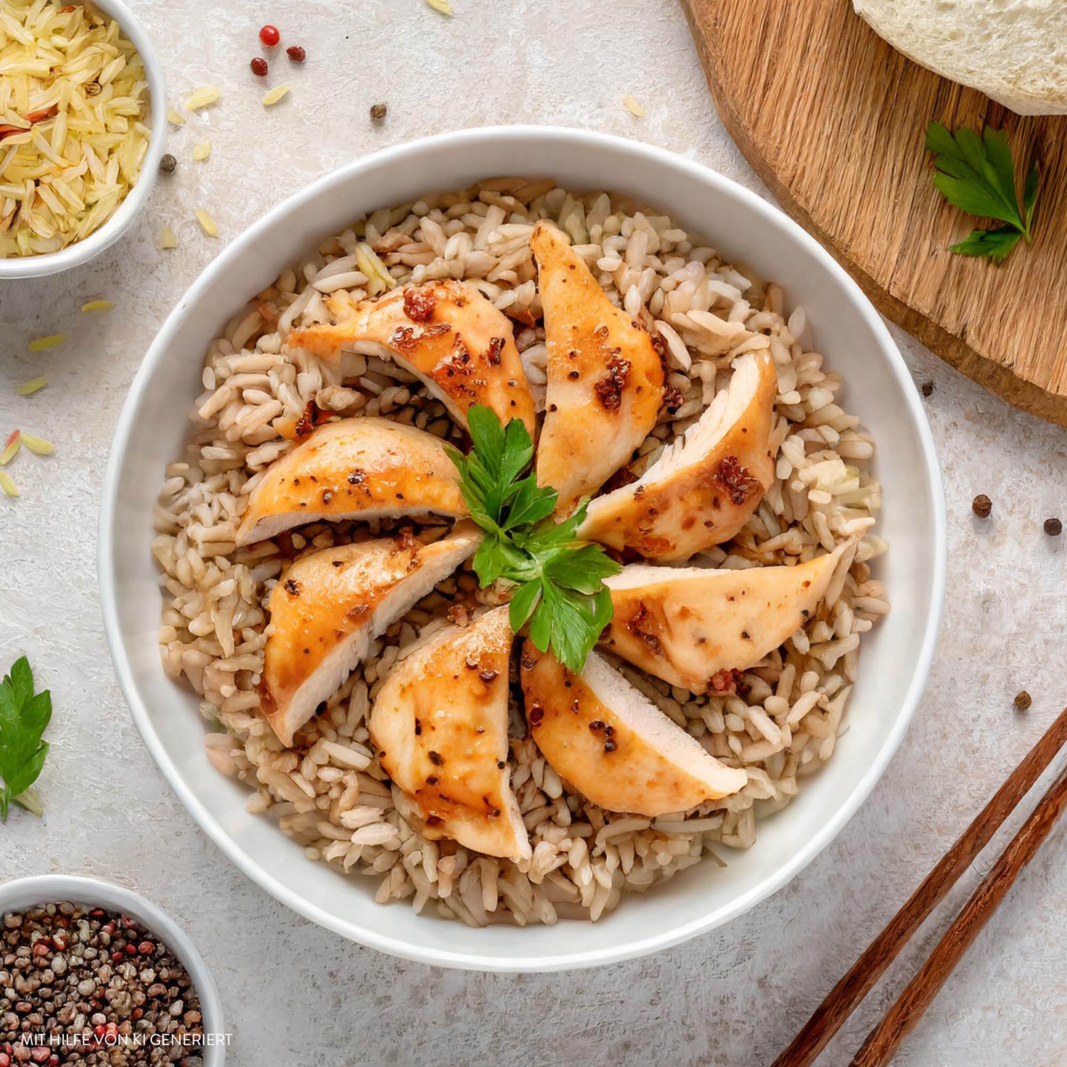 Saftig gegartes Hähnchenbrustfilet serviert mit Reis. Ein leichtes und proteinreiches Gericht, einfach in der Zubereitung. Zum Rezept
