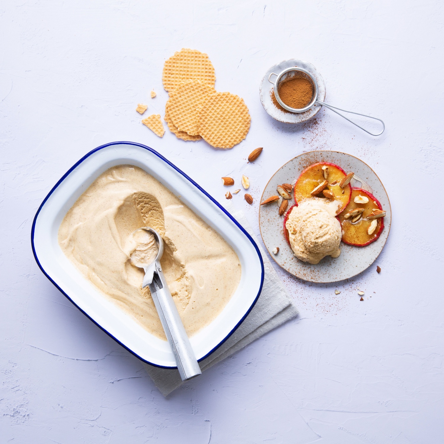 - Zu dem Zimt-Eis passen gut gebratene karamellisierte Apfelscheiben und geröstete, gehackte Mandeln.