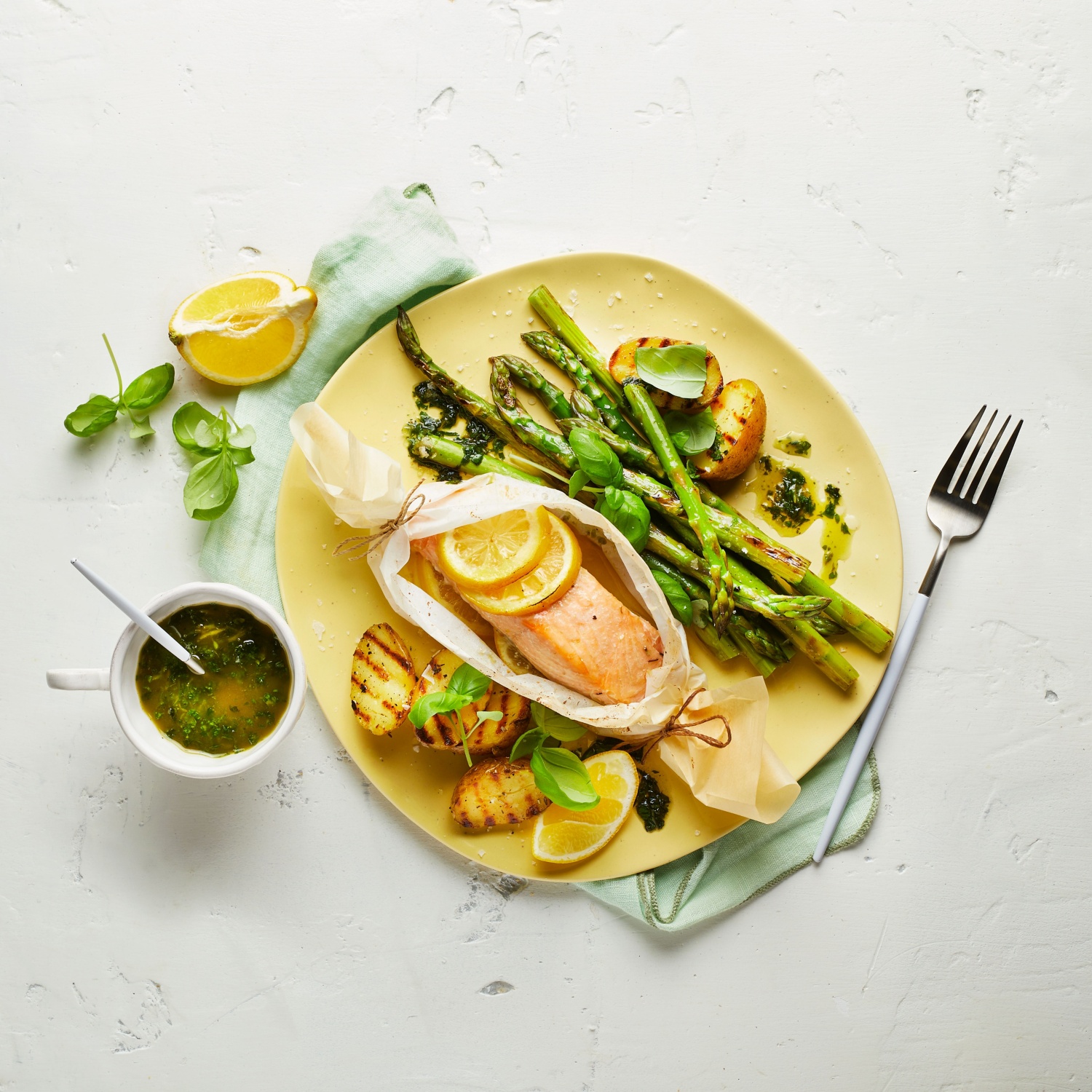 Frisch und frühlingshaft schmeckt der Zitronen-Lachs in Basilikum-Marinade – serviert mit grünem Spargel und leckeren Kartoffeln vom Grill. Zum Rezept