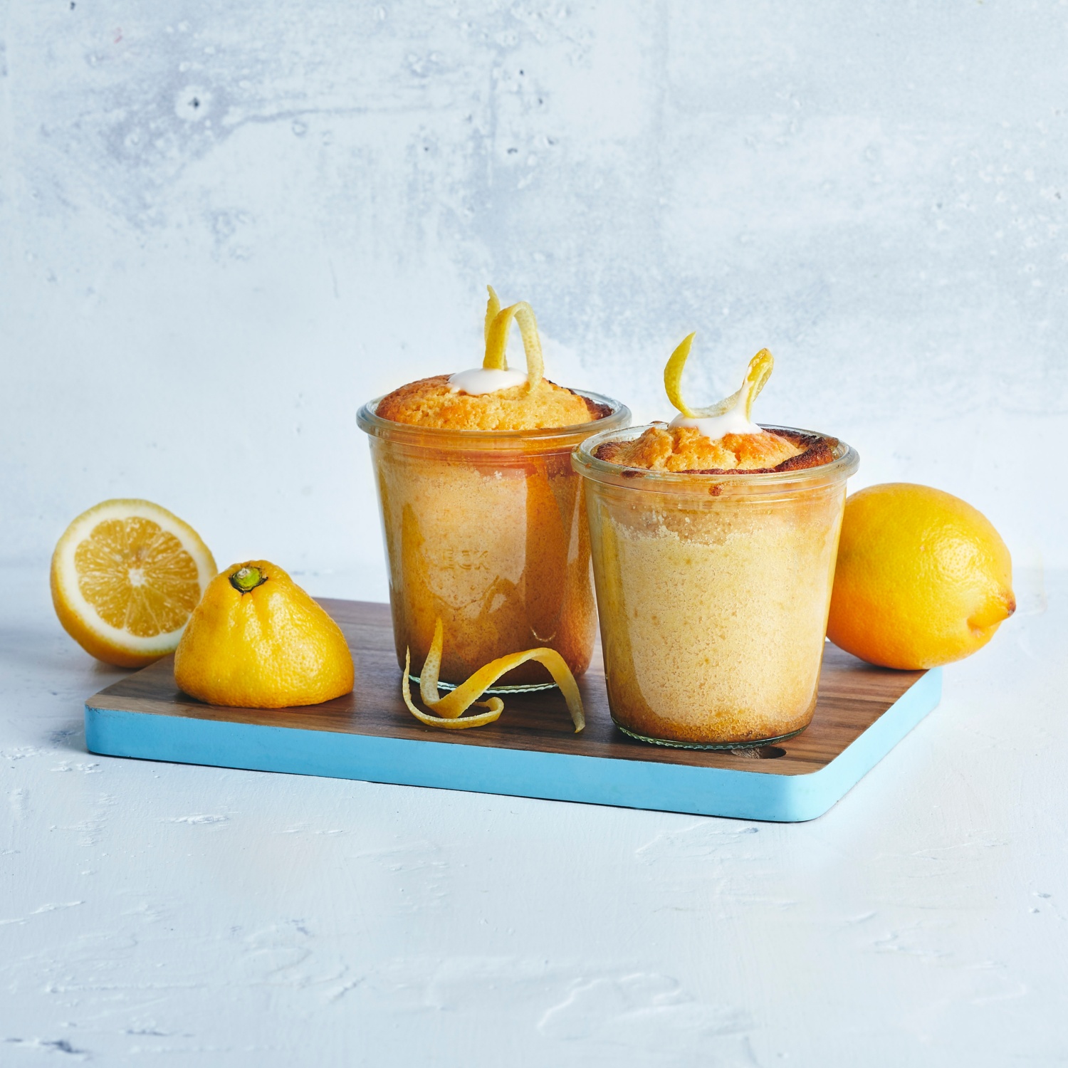 - Die Einweckgläser einfetten und zu 2/3 mit dem Teig füllen. Den Zitronenkuchen im vorgeheizten Ofen bei 175 °C Ober- und Unterhitze 30-35 Minuten backen. Stäbchenprobe machen.