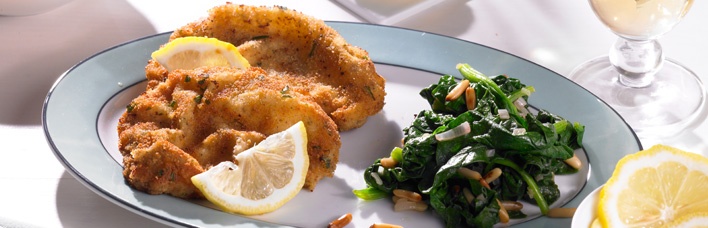 Das leichte Zitronenschnitzel mit Spinat ist ein köstlicher Klassiker. Als Beilage schmecken Pommes besonders gut. Zum Rezept