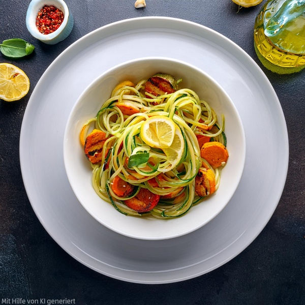 Ein sommerlich leichtes Gericht: Zoodles mit aromatischem geröstetem Gemüse und erfrischendem Zitronen-Dressing. Perfekt für heiße Tage!