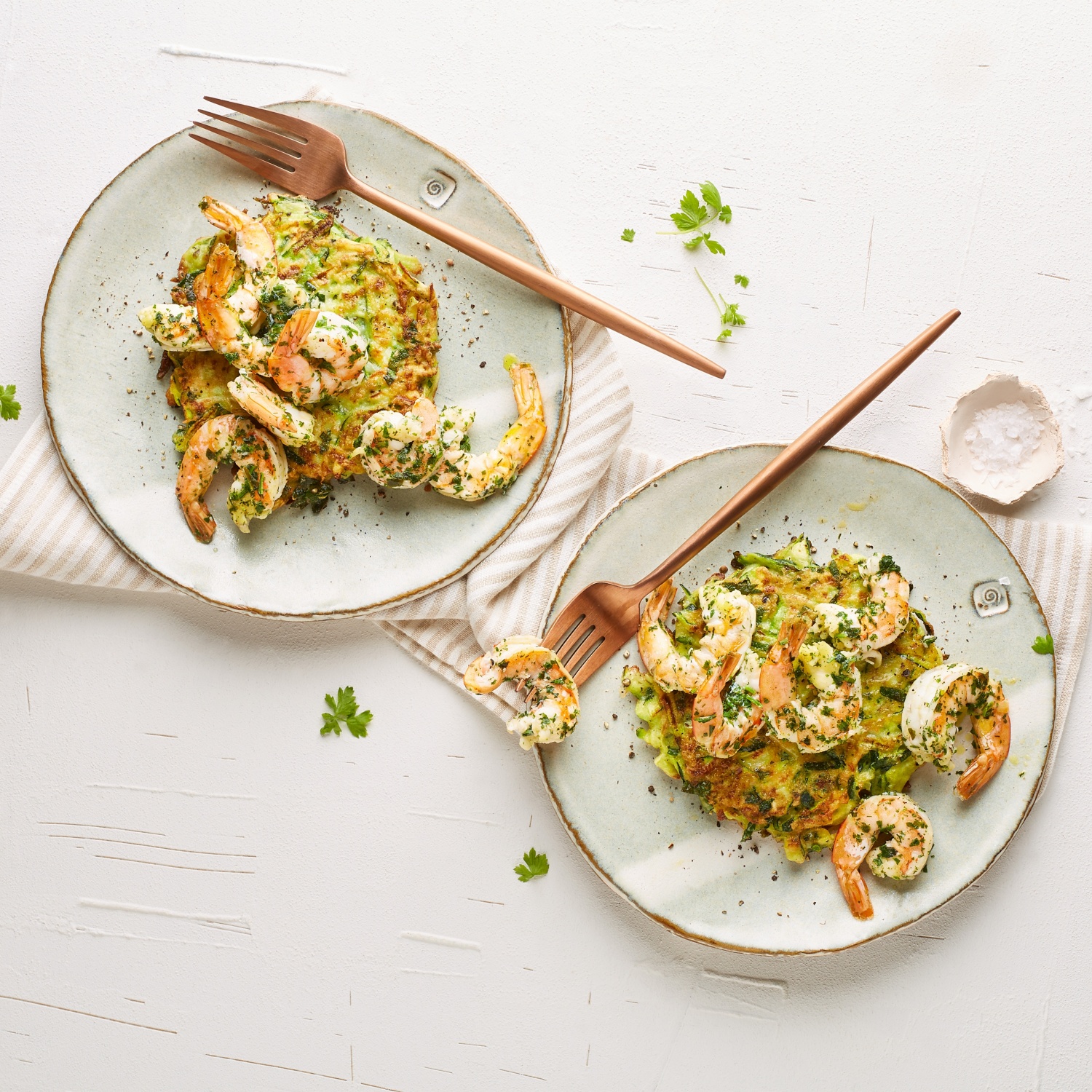 Zucchinipuffer mit gebratenen Riesengarnelen