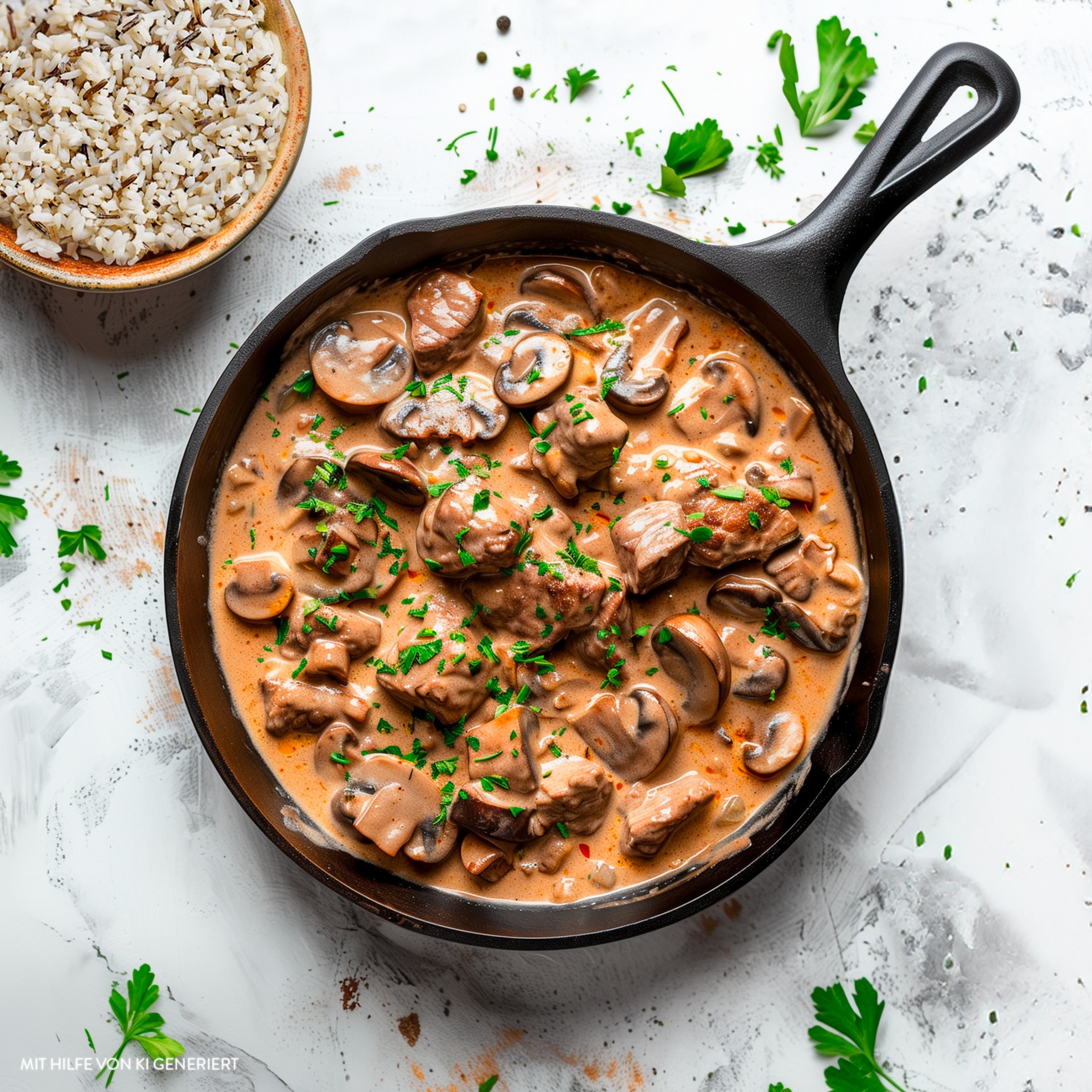 - Das Zürcher Geschnetzelte mit gehackter Petersilie garnieren und zusammen mit dem Wildreis servieren.