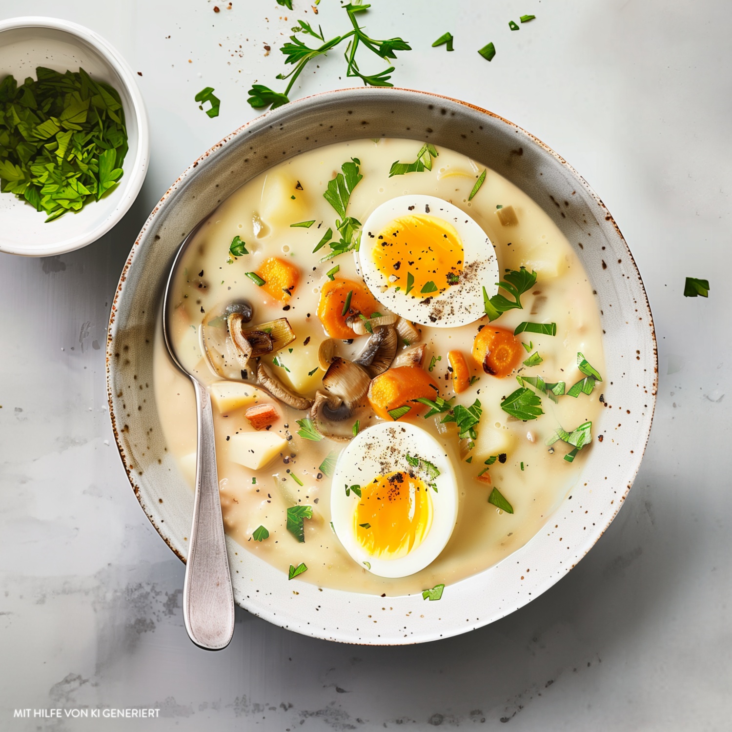 - Die Zurek mit den halbierten Eiern und gehackter Petersilie garnieren.