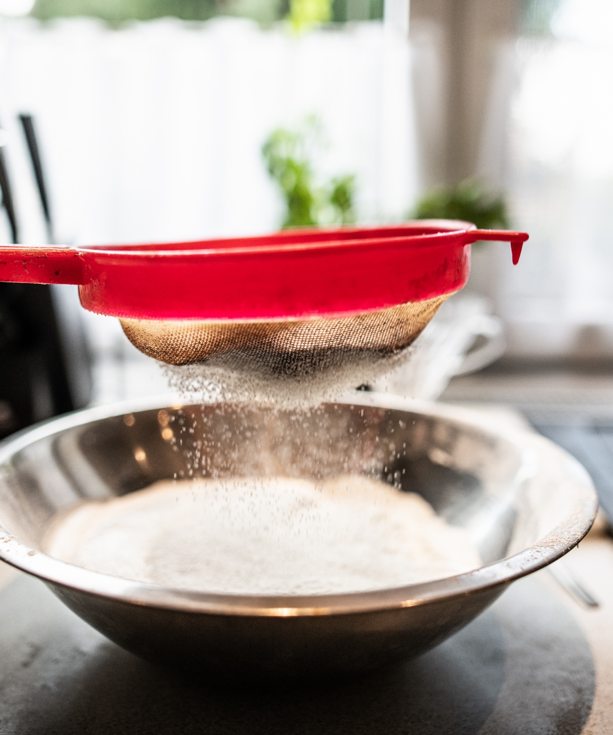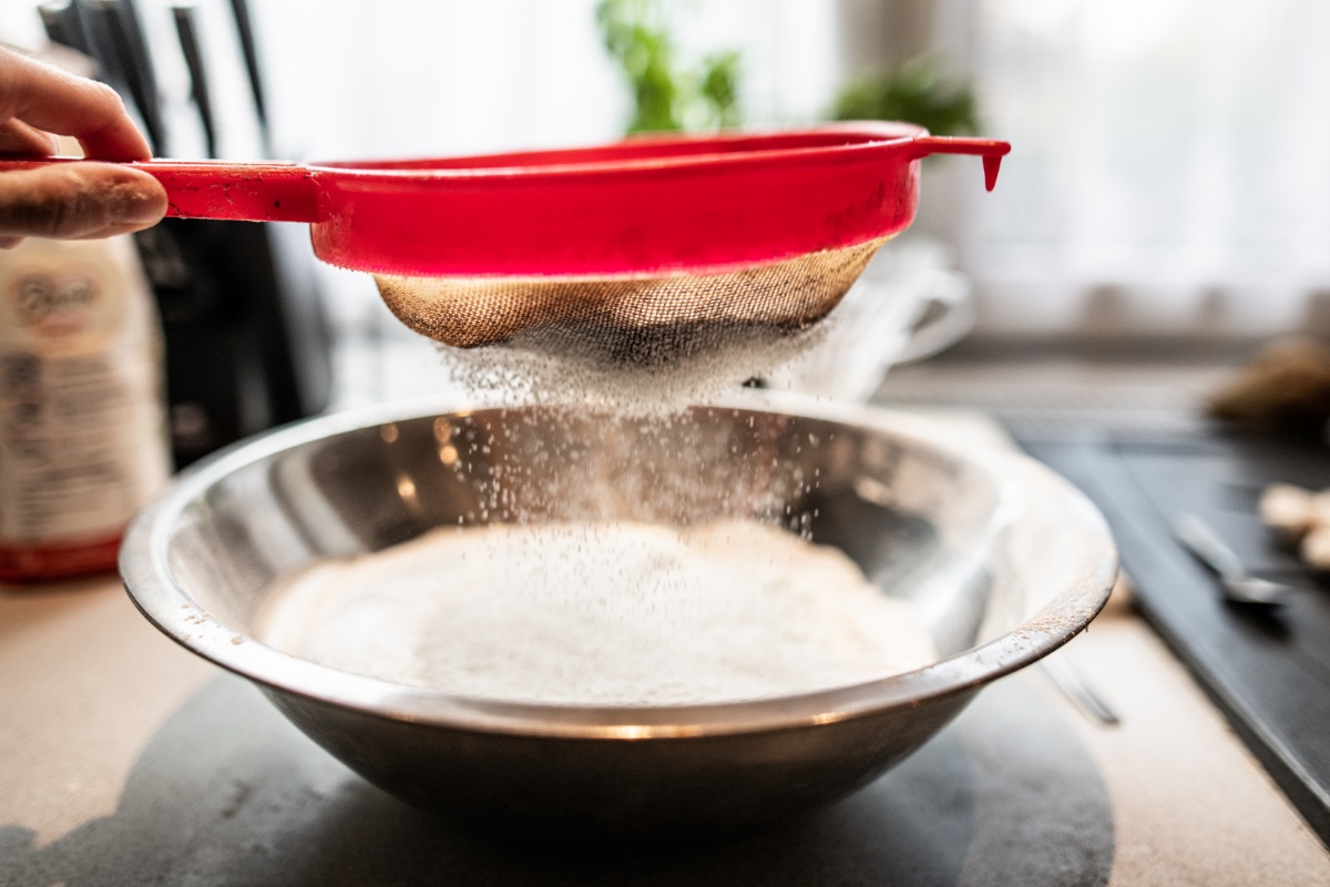 Trockene Zutaten wie Mehl, Stärke und auch Backpulver sollten in den Teig gesiebt werden. Auf diese Weise vermeidest du Klümpchen und hilfst Backpulver und Stärke dabei, sich gleichmäßig im Mehl zu verteilen.
