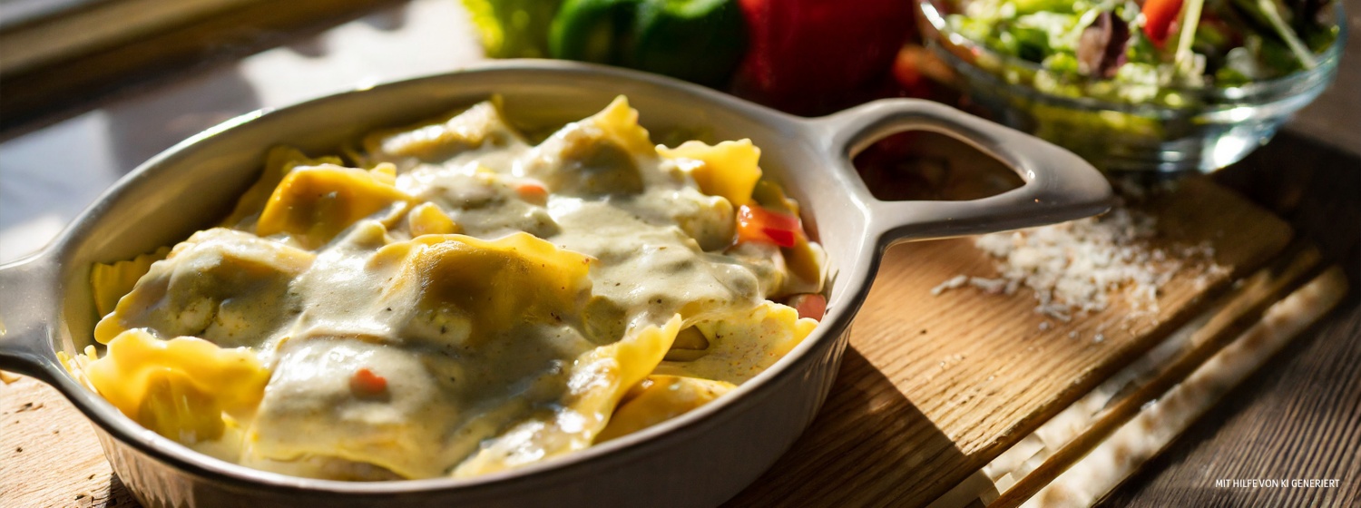 Ob überbacken mit geschmolzenem Käse oder knusprig gebacken mit einer aromatischen Kruste – der Ofen intensiviert den Geschmack der Ravioli und lässt diese zu einem wahren Genuss werden. Probiere deine Ravioli in der Pfanne zu braten und gib die Gemüse-Beilagen direkt hinzu.