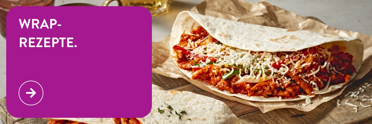 Drei gefüllte Wraps mit frischem Gemüse, Salat, Tomaten und Fleisch auf einem Holzbrett, nah aufgenommen.