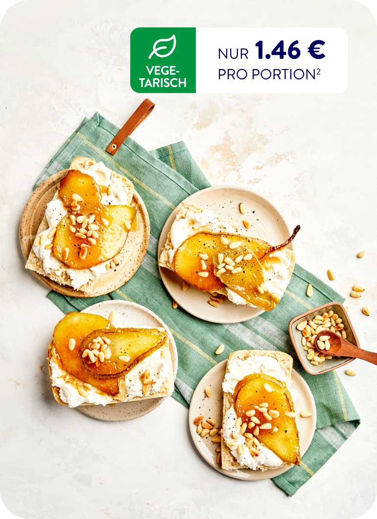 200 g CUCINA NOBILE Mozzarella-Maxirolle: 1,45 € (400 g = 2,89 € / 1 kg = 7,23 €) / 80 g HOFBURGER Körniger Frischkäse: 0,40 € (200 g = 0,99 € / 1 kg = 4,95 €) / 2 EL DELIKATO Wein-Branntwein-Essig (30 ml): 0,01 € (1 l = 0,38 €) / 2 NATUR LIEBLINGE Birnen Conference: 0,41 € (1 kg Packung = 1,69 €) / 50 g MILSANI Deutsche Markenbutter: 0,30 € (250 g = 1,49 € / 1 kg = 5,96 €) / 50 g SWEET VALLEY Pinienkerne: 2,59 € (50 g = 2,59 € / 1 kg = 51,80 €) / 4 Baguette-Brötchen: 0,69 € (300 g = 0,69 € / 1 kg = 2,30 €)