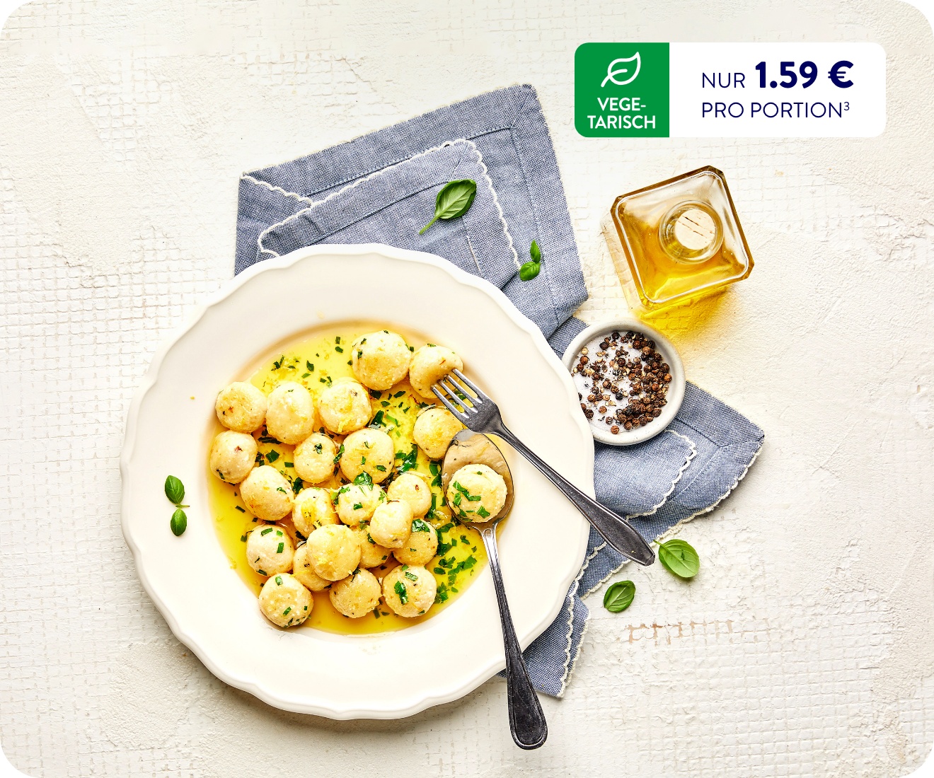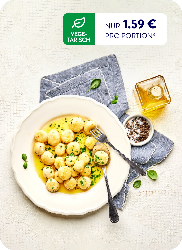 500 g HOFBURGER Körniger Frischkäse: 2,48 € (200 g = 0,99 € / 1 kg = 4,95 €) / 125 g CUCINA NOBILE Parmigiano Reggiano: 2,49 € (125 g = 2,49 € / 1 kg = 19,92 €) / 4 EL GOLDÄHREN Weizenmehl Type 405 (32 g): 0,03 € (1 kg = 0,79 €) / 1 LANDFREUDE Ei: 0,17 € (10 Stück = 1,69 €) / 100 g GOLDÄHREN Hartweizengrieß: 0,16 € (500 g = 0,79 € / 1 kg = 1,58 €) / ½ Topf Bio-Topfkräuter Basilikum: 0,65 € (1 Topf = 1,29 €) / ½ NATUR LIEBLINGE KLEINE SCHÄTZE Premium Zitrone: 0,30 € (1 Stück = 0,59 €) / 20 g MILSANI Deutsche Markenbutter: 0,12 € (250 g / 1,49 € / 1 kg = 5,96 €)