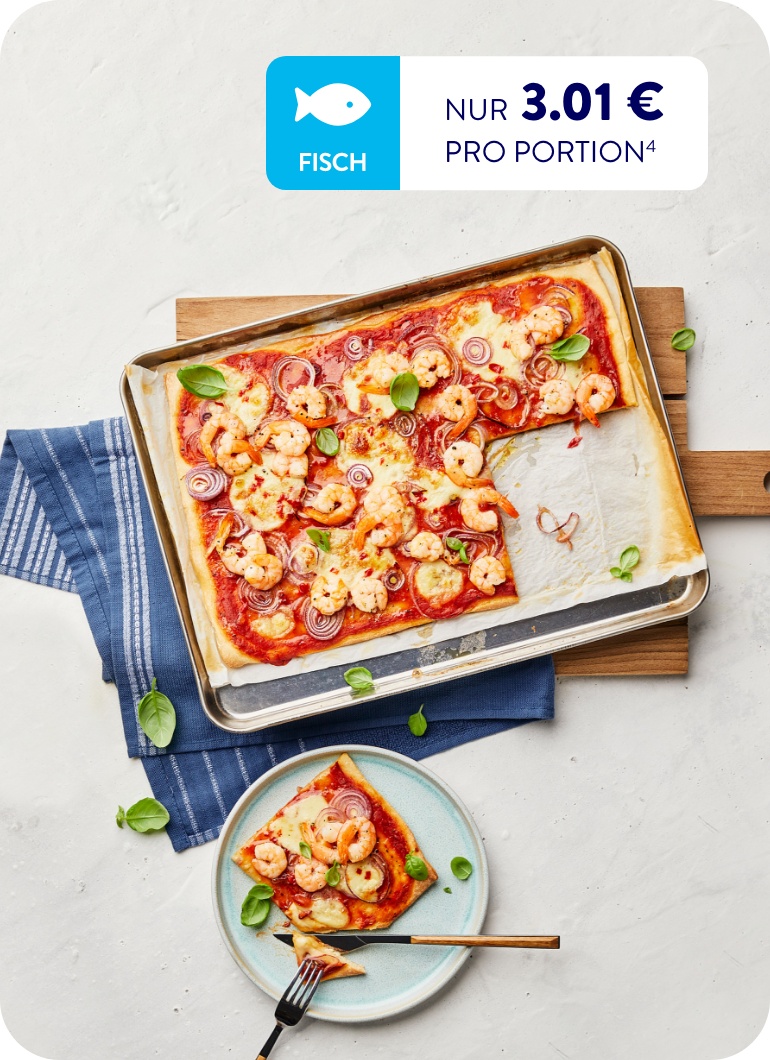 400 g GOLDEN SEAFOOD Riesengarnelenschwänze: 6,56 € (225 g = 3,69 € / 1 kg = 16,40 €) / 2 EL CANTINELLE Natives Olivenöl extra (30 ml): 0,20 € (750 ml = 4,99 € / 1 l = 6,65 €) / 2 Zehen NATUR LIEBLINGE Knoblauch: 0,02 € (200 g Netz = 0,69 € / 1 kg = 3,45 €) / 2 GUT BIO Bio-Speisezwiebeln rot: 0,26 € (500 g Netz = 0,99 € / 1 kg = 1,98 €), aus unserer Werbung / 1 rote Chili aus NATUR LIEBLINGE Chili-Mix: 0,08 € (50 g Schale = 0,79 € / 1 kg = 15,80 €) / 250 g CUCINA NOBILE Mozzarella: 1,98 € (125 g = 0,99 € / 1 kg = 4,50 €) / 600 g CUCINA NOBILE Pizzateig mit Tomatensauce: 2,29 € (600 g = 2,29 € / 1 kg = 3,82 €) / ½ Topf Bio-Topfkräuter Basilikum: 0,65 € (1 Topf = 1,29 €)