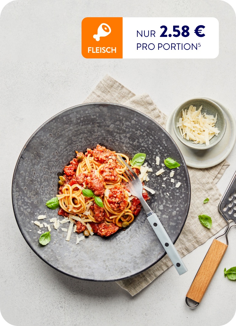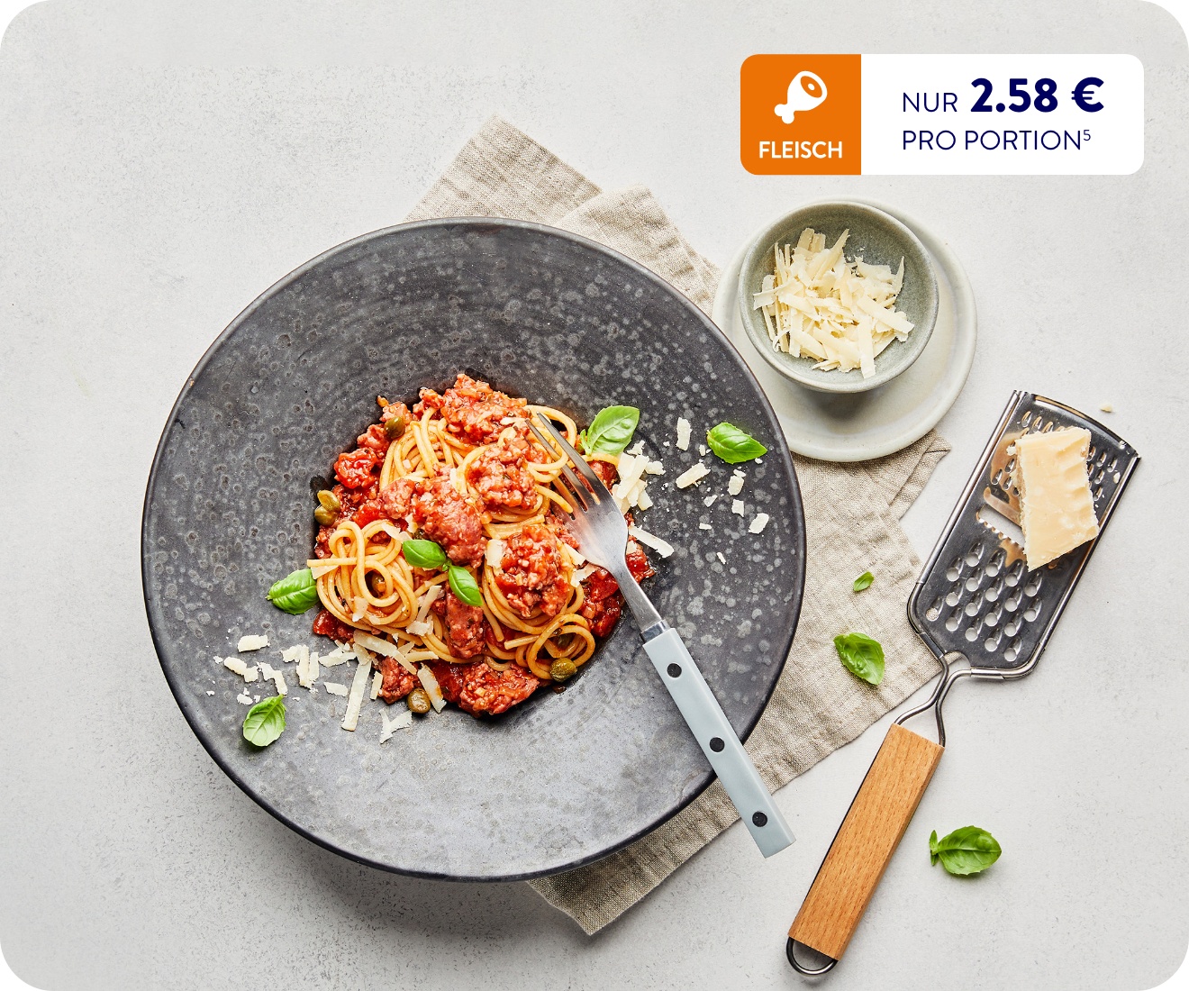 5 NATUR LIEBLINGE Schalotten: 0,32 € (250 g Netz = 0,79 € / 1 kg = 3,16 €) / 3 Zehen NATUR LIEBLINGE Knoblauch: 0,03 € (200 g Netz = 0,69 € / 1 kg = 3,45 €) / 300 g CUCINA NOBILE Italienische Salsiccia: 3,49 € (300 g = 3,49 € / 1 kg = 11,63 €) / 2 EL CANTINELLE Natives Olivenöl extra (30 ml): 0,20 € (750 ml = 4,99 € / 1 l = 6,65 €) / 100 ml Rotwein, z.B. Merlot: 0,29 € (750 ml = 2,19 € / 1 l = 2,92 €) / 800 g KING'S CROWN Tomaten fein gehackt: 2,83 € (240 g = 0,85 € / 1 kg = 3,54 €) / 3 EL ALL SEASONS Italienische Kräuter (30 g): 0,34 € (75 g = 0,85 € / 1 kg = 11,33 €) / 500 g CUCINA NOBILE Spaghetti: 0,99 € (500 g = 0,99 € / 1 kg = 1,98 €) / 50 g CUCINA NOBILE Parmigiano Reggiano: 1,00 € (125 g = 2,49 € / 1 kg = 19,92 €) / 1 EL CUCINA NOBILE Eingelegte Gewürze, Sorte: Kapern (15 g): 0,20 € (60 g = 0,79 € / 1 kg = 13,17 €) / ½ Topf Bio-Topfkräuter Basilikum: 0,65 € (1 Topf = 1,29 €)