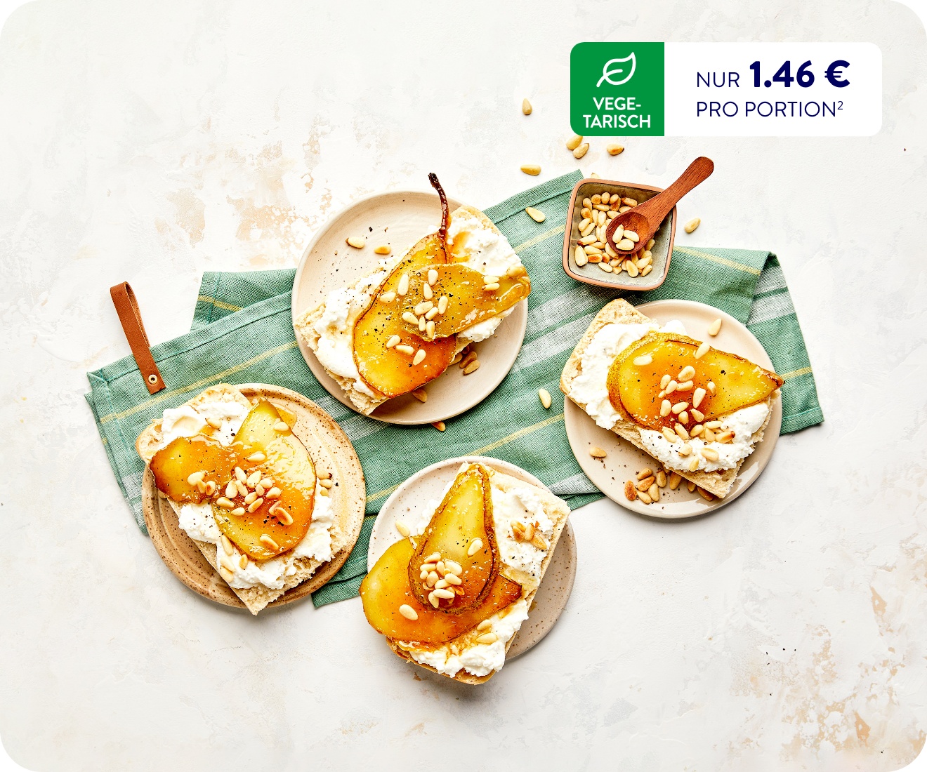 Mozzarella-Creme mit karamellisierter Birne auf Baguette-Brötchen