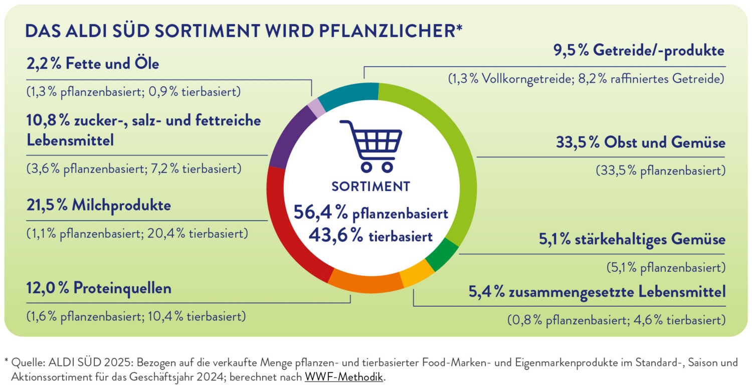 Bezogen auf das ALDI SÜD Food-Sortiment liegt der pflanzenbasierte Anteil bei 56,4 %, während sich der tierbasierte Anteil auf 43,6 % beläuft.*