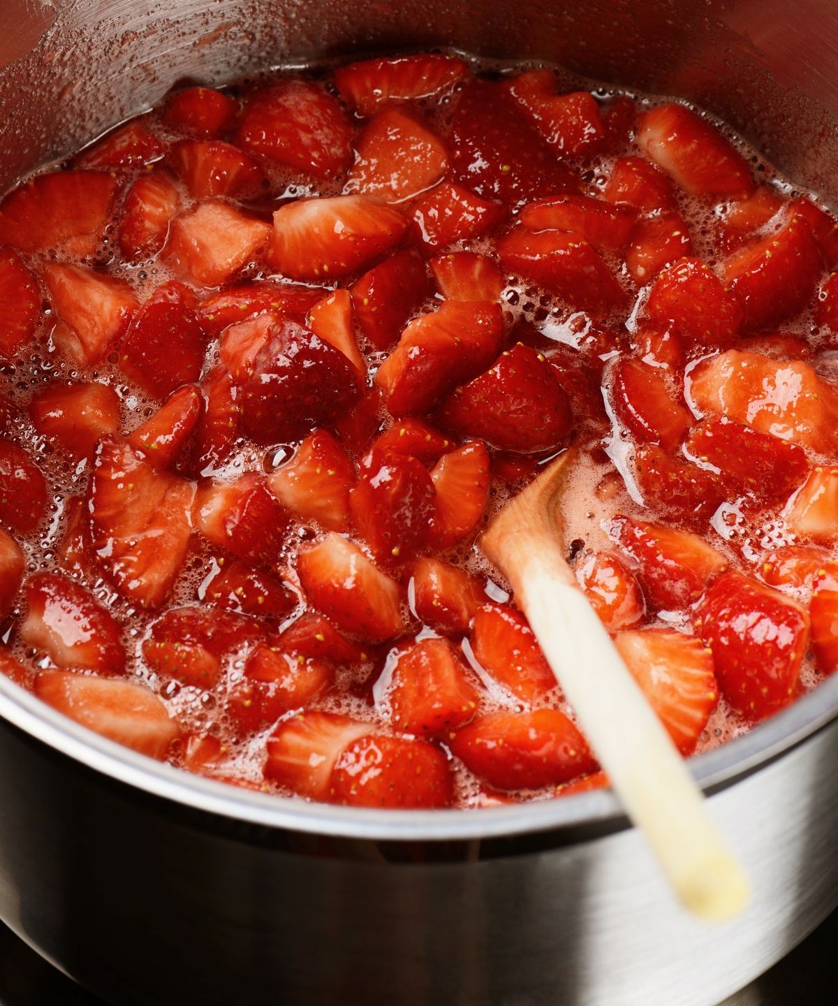Koche die Erdbeeren bei mittlerer Hitze weich. Du kannst sie gerne auch pürieren. Die weiche Erdbeermasse durch ein Sieb abtropfen lassen.