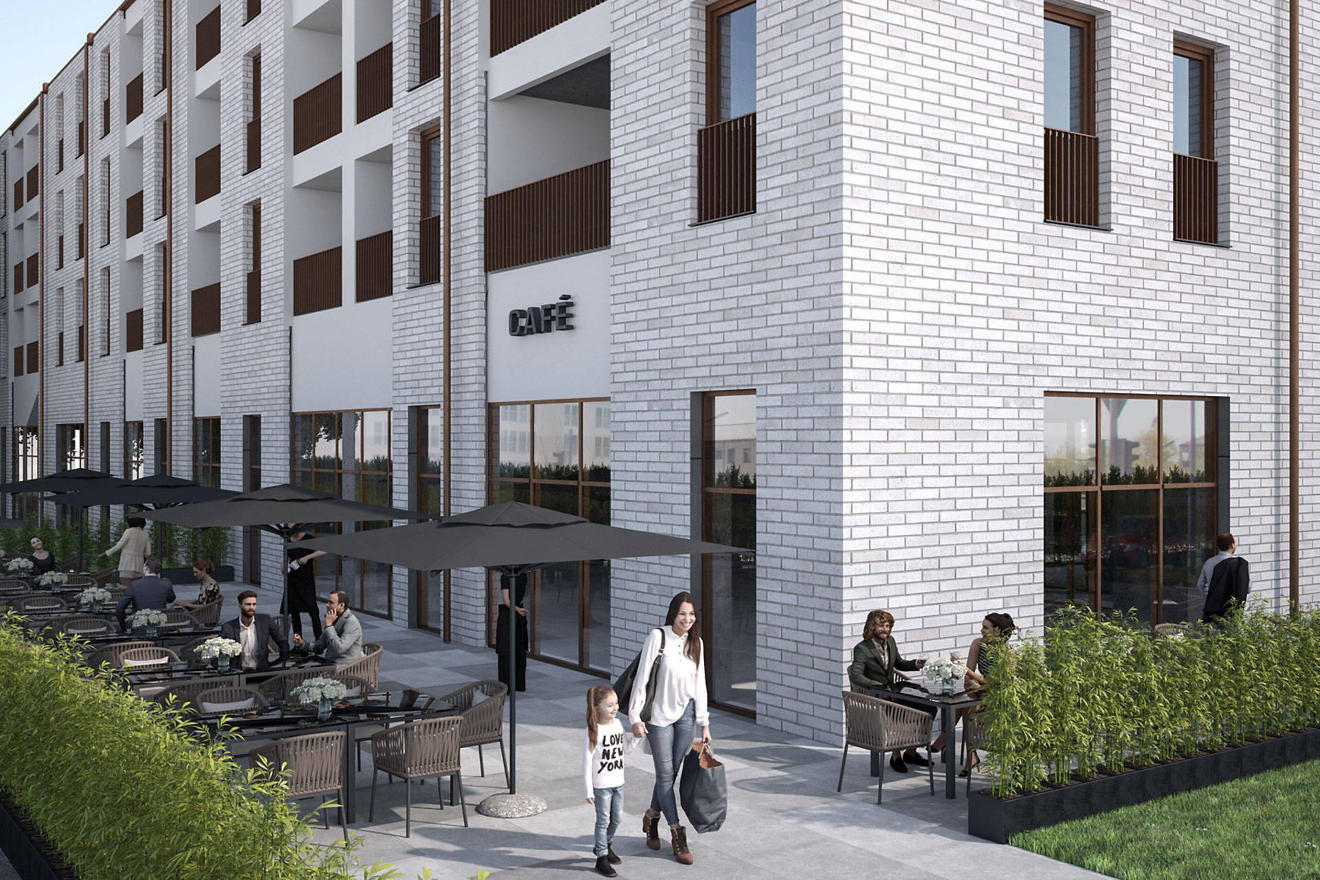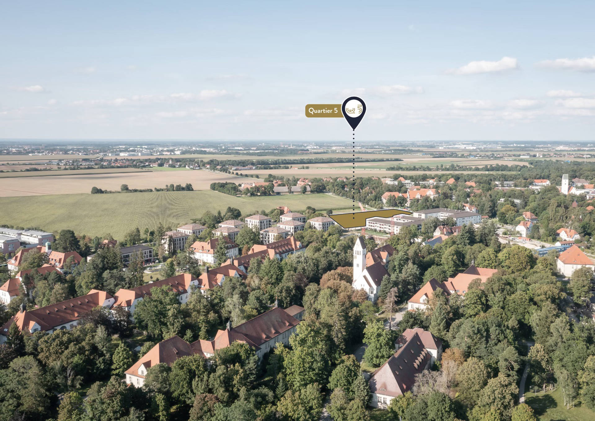 Im Erdgeschoss des Gebäudes Quartier 5.1 entsteht eine ALDI SÜD Filiale mit einer Verkaufsfläche von rund 1.100 Quadratmetern. Angrenzend, im Quartier 5.2, sind insgesamt ca. 860 Quadratmeter Einzelhandels- und Gewerbeflächen vorgesehen. Mittendrin befindet sich eine Gastronomiefläche mit Außenterrasse und Blick ins Grüne. Zwischen und vor den Gebäuden verlaufen weitläufige Arkaden. Oberhalb der ALDI SÜD Filiale – in den Obergeschossen 1 bis 3 – entstehen Büros. Der Mieter für die Gesamtfläche von ca. 4.000 Quadratmetern steht bereits fest.