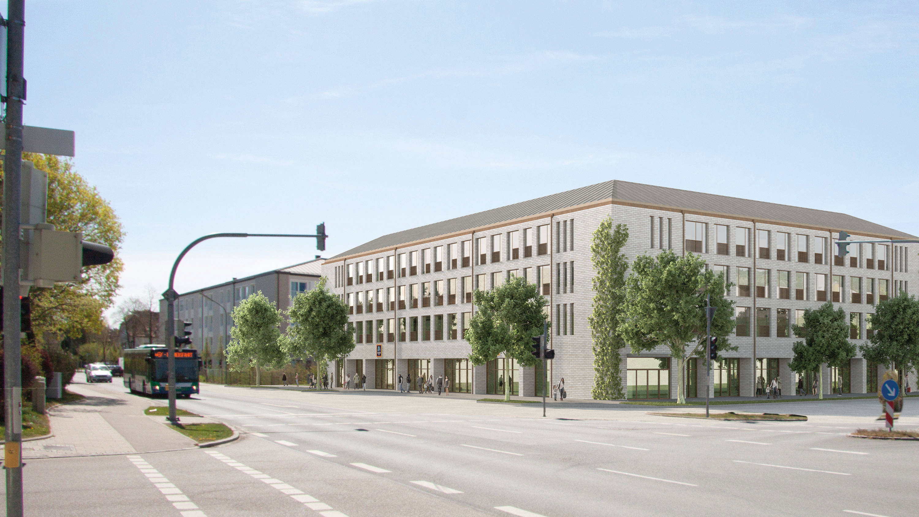 Im „Quartier 5“, gleich an der Leibstraße, Kreuzung Vockestraße, entsteht auf etwa 9.000 Quadratmetern eine viergeschossige Mischimmobilie. Das Bauprojekt umfasst zwei Gebäude mit Wohnungen, Büros, einer ALDI SÜD Filiale sowie weiteren Gewerbeflächen. Eine Tiefgarage und ebenerdige Stellplätze bieten ausreichend Parkflächen. Vor dem Gebäude entsteht außerdem ein geräumiger Platz, der zum Verweilen einlädt.