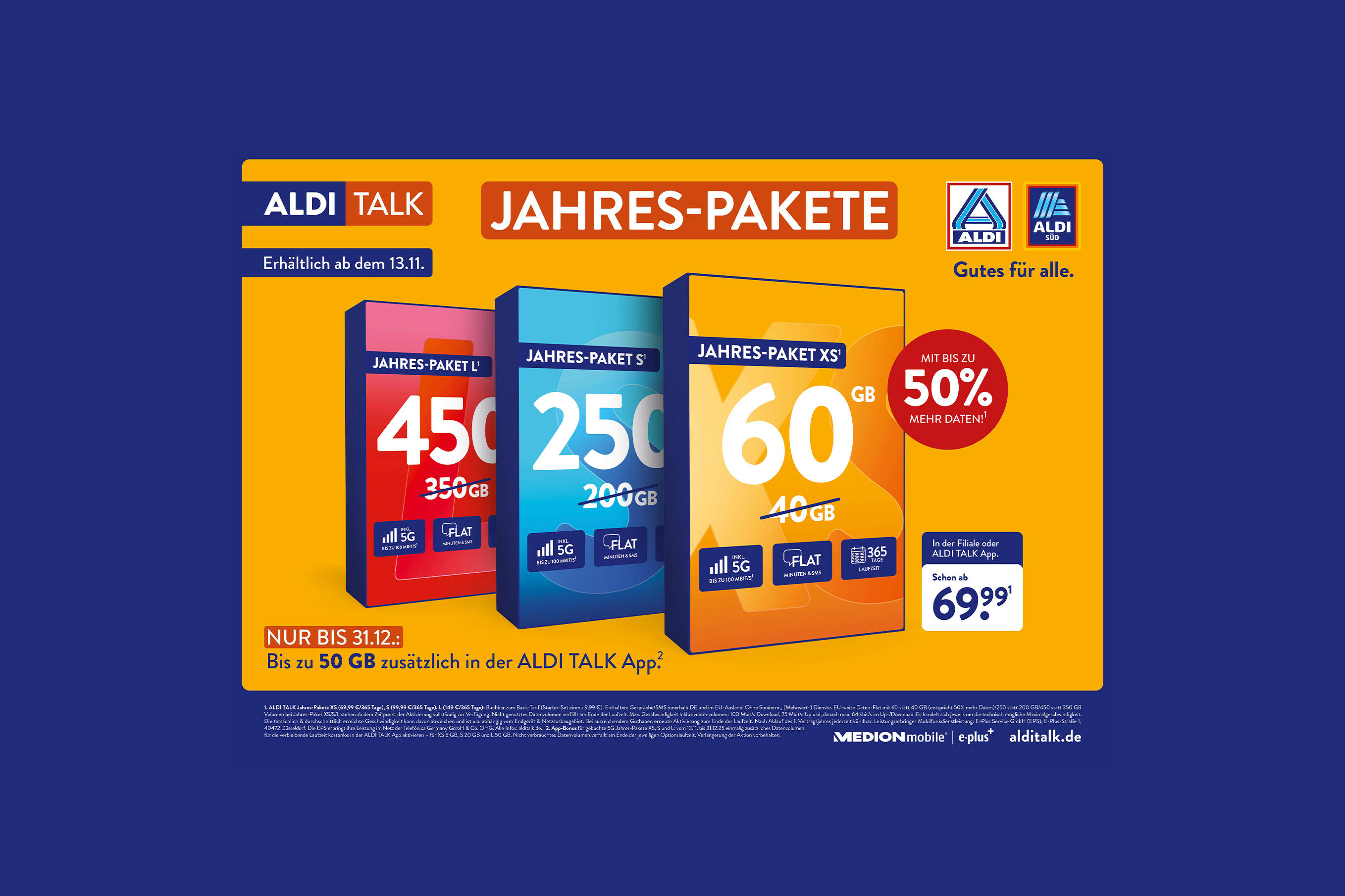 ALDI TALK: Jahres-Pakete mit bis zu 50 Prozent¹ mehr Datenvolumen zum gleichen Preis und bis zu 50 GB App-Bonus erhältlich². | 07.11.2025