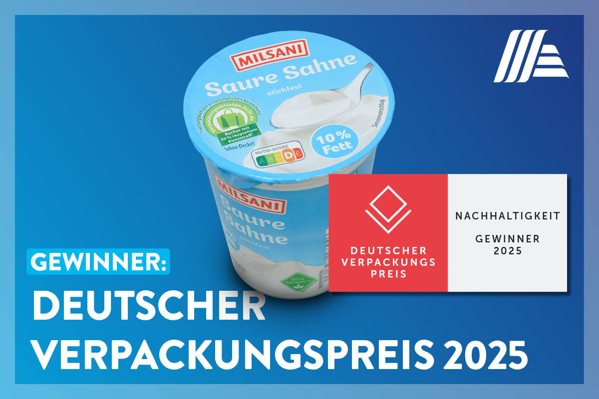 Der MILSANI Saure-Sahne-Becher von ALDI SÜD hat den Deutschen Verpackungspreis 2025 gewonnen. Eingereicht von der Unternehmensgruppe Theo Müller, dem Kunststoffproduzenten INEOS Styrolution und der Optipack GmbH, gewann der MILSANI Saure-Sahne-Becher in der Kategorie „Nachhaltigkeit: Rezyklateinsatz“. Der Becher, der seit Anfang des Jahres bei ALDI SÜD im Handel ist, hat einen Rezyklatanteil (gebrauchte Kunststoffe) von 30 Prozent und spart so jährlich bis zu zehn Tonnen Neukunststoff ein. Diese „CO2-reduzierende Anwendung“ sei ein „ehrwürdiger Fortschritt“, so die Jury des Deutschen Verpackungsinstituts (dvi) in ihrer Bewertung.