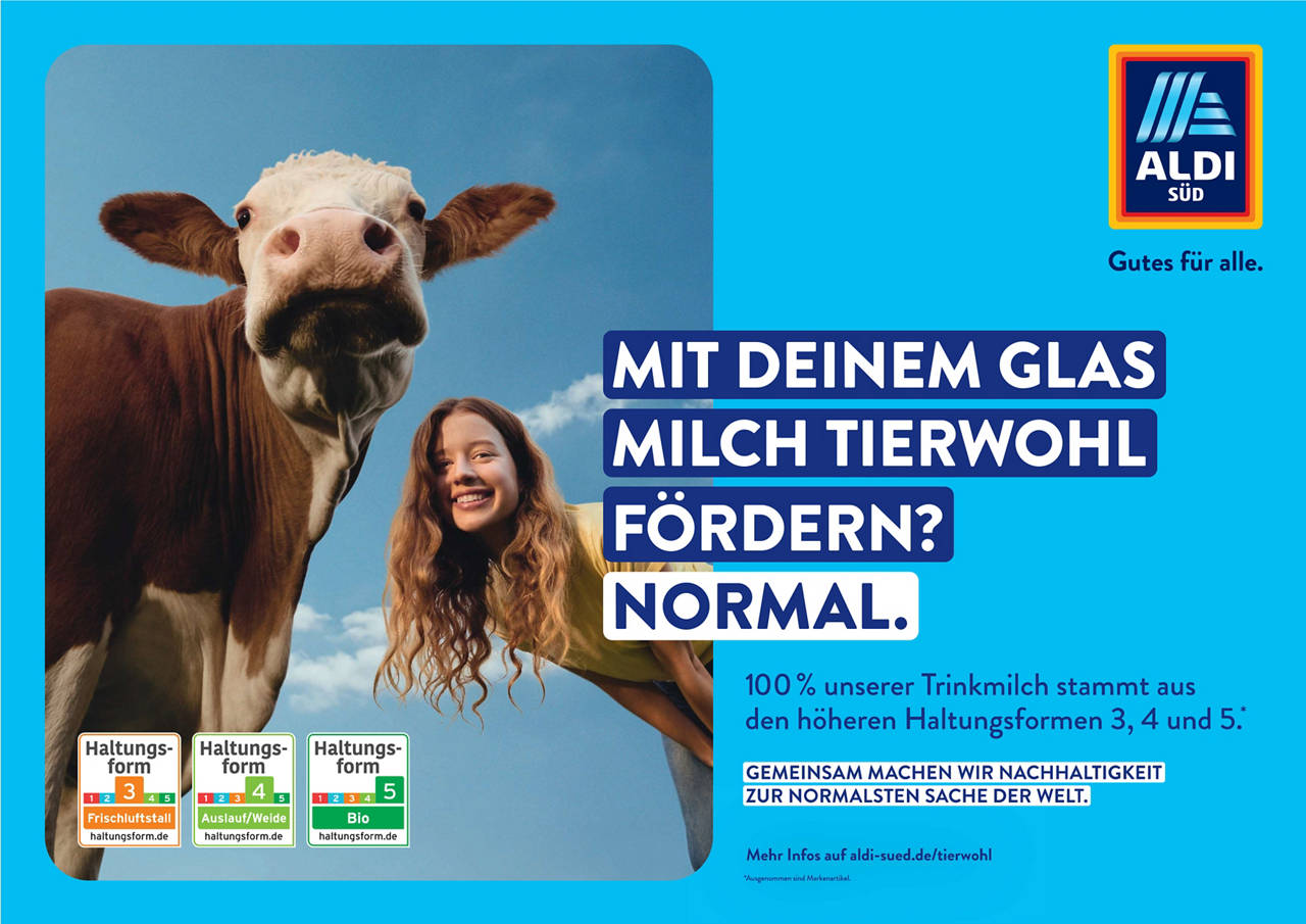 Nachdem ALDI SÜD bereits am 22. September eine Kampagne für mehr Ernährungsbildung gestartet und sein Engagement bei dem Bildungsprogramm GemüseAckerdemie von Acker e.V. beleuchtet hat, legt der Discounter jetzt nach. Seit dem 6. Oktober rückt ALDI SÜD weitere Aspekte seines nachhaltigen Engagements in den Fokus. Im Mittelpunkt stehen die Themen Tierwohl und Bio. So zeigt der Bio-Händler Nr. 1 im eigenen Vertriebsgebiet1 ein Motiv mit einer klaren Bio-Botschaft: ,,Mit deinem Einkauf die Natur schonen? Normal‘‘. Dazu bietet ALDI SÜD bereits jetzt über 1.000 Bio-Produkte2 in seinem Sortiment an. Zudem macht der Tierwohl-Vorreiter mit einem weiteren Motiv auf seine Erfolge beim #Haltungswechsel aufmerksam. ,,Mit deinem Glas Milch Tierwohl fördern? Normal‘‘, heißt es dort. Um das seinen Kund:innen zu ermöglichen, hat ALDI SÜD die Eigenmarken-Trinkmilch bereits vollständig auf die höheren Haltungsformen 3, 4, und 5 umgestellt.