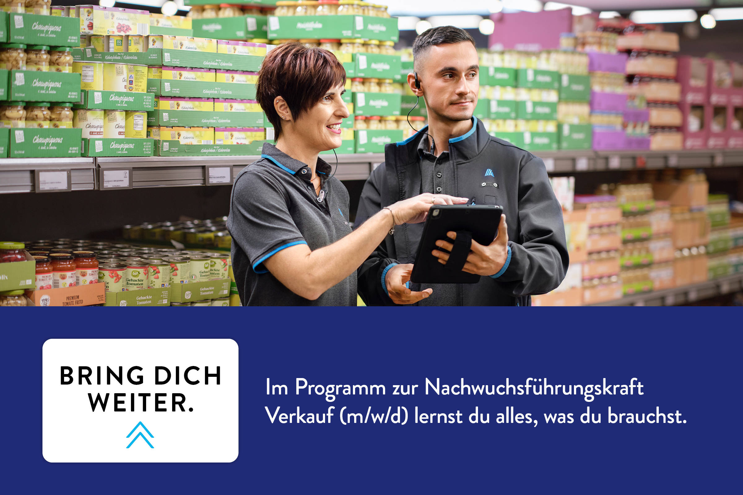 Unter dem Kampagnenmotto „Bring dich weiter.“ sucht ALDI SÜD gezielt Mitarbeiter:innen, die bereit sind, den nächsten Schritt in eine Führungsposition zu wagen. Fragestellungen wie „Wenn du weißt, wie die Filiale läuft, wieso leitest du sie dann nicht?“ sind dabei Teil der Kampagnenkommunikation. Als verantwortungsbewusster Arbeitgeber bietet ALDI SÜD ein strukturiertes Einstiegsprogramm, das die Teilnehmer:innen systematisch auf ihrem Weg zur Führungskraft begleitet.