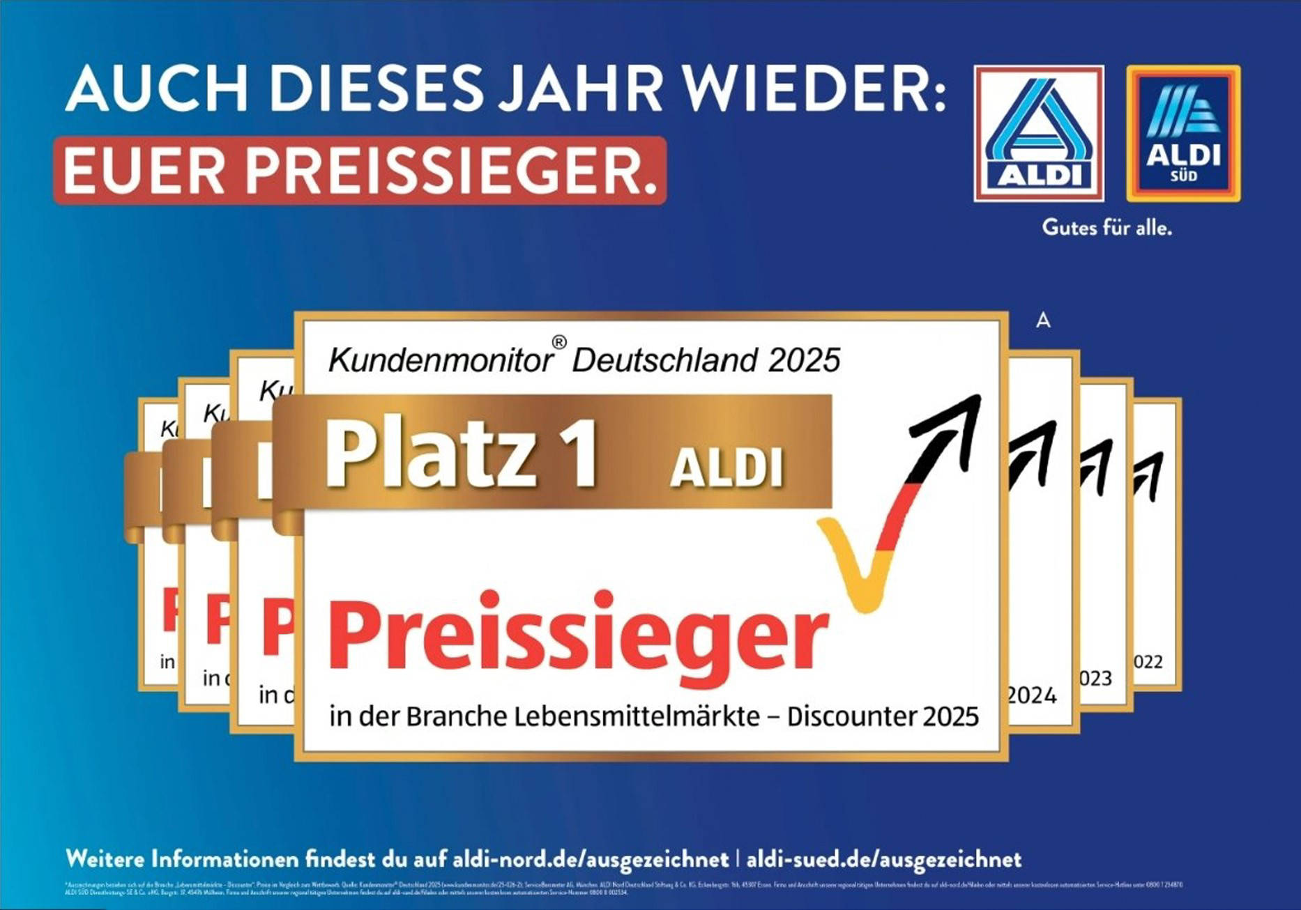 ² Auszeichnungen beziehen sich auf die Branche „Lebensmittelmärkte – Discounter“. Quelle: Kundenmonitor® Deutschland 2025 (www.kundenmonitor.de/25-026-2); ServiceBarometer AG, München.