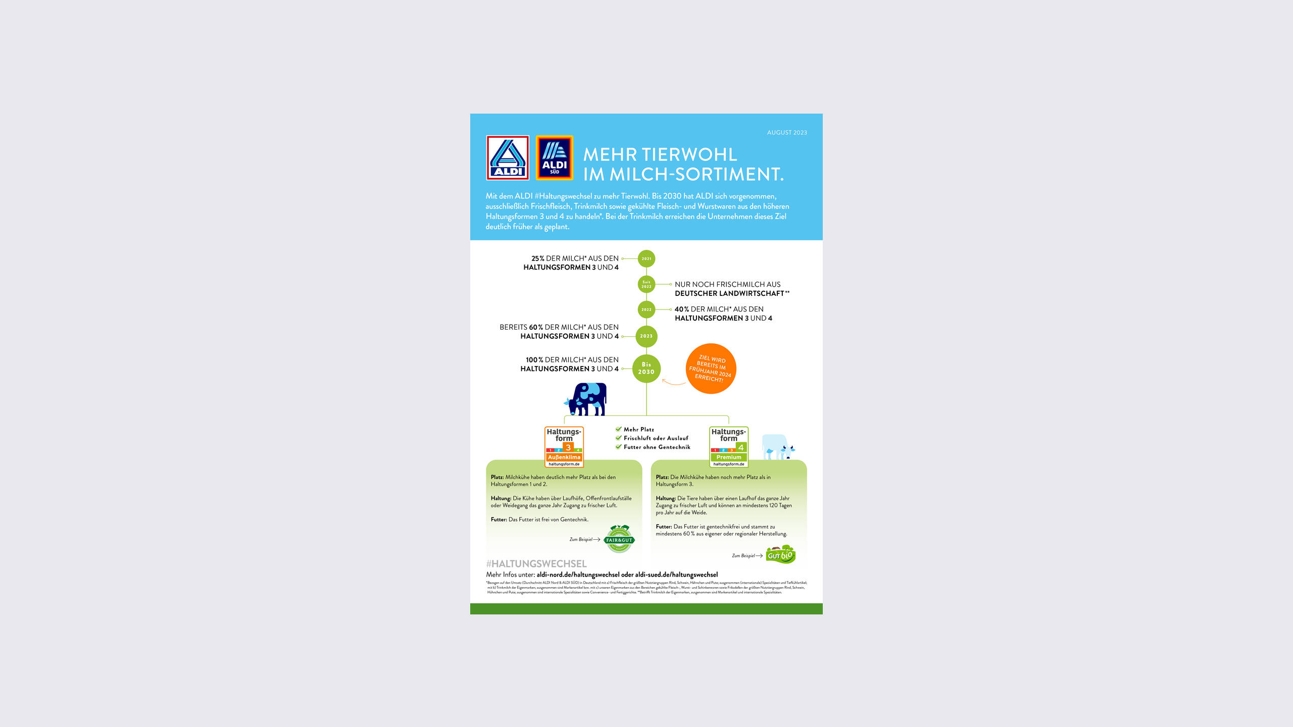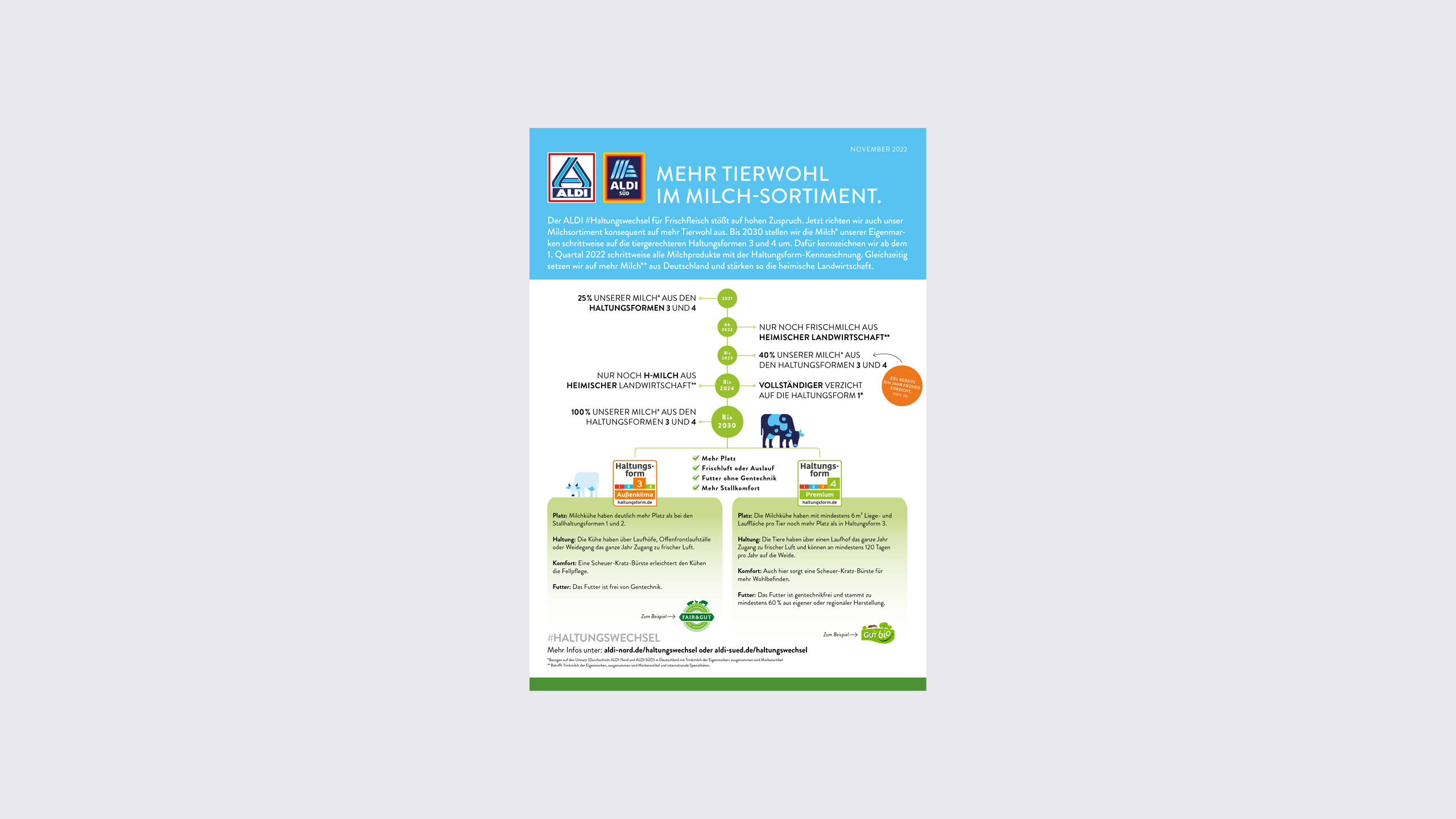 Informationen zum Thema "Mehr Tierwohl im Milch-Sortiment" bei ALDI SÜD. (Stand: November 2022)