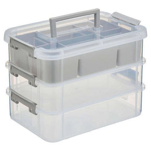 - Stapelbare Boxen (L 27,5 x B 18 x H 19,5 cm) mit 3 Lagen und Einsatz mit 6 Fächern, sowie Verschluss in verschiedenen Farben