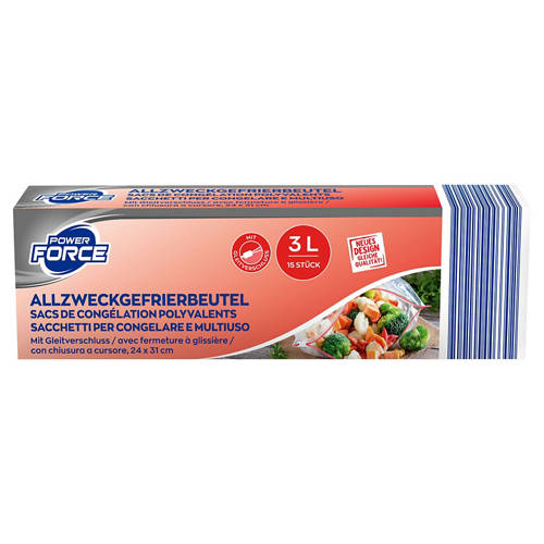 Materialinfo PE: Die Power Force Gefrierbeutel bestehen aus hochwertigem, recyclefähigem Polyethylen (PE).